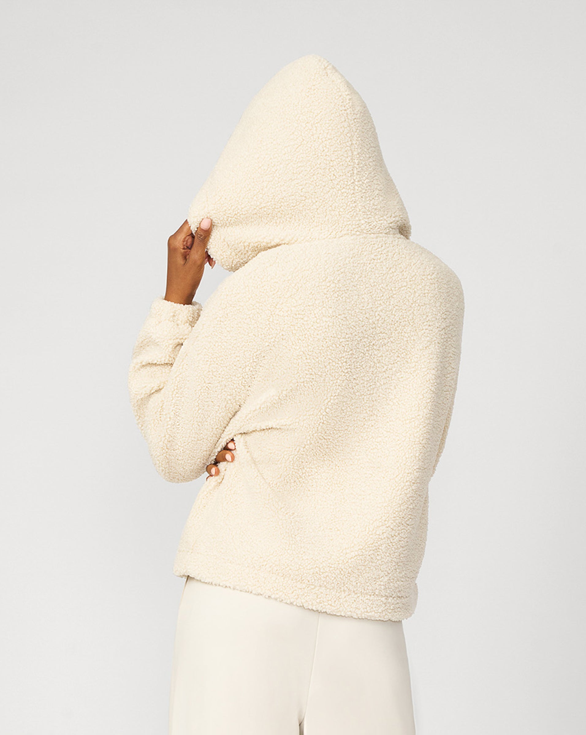 • Cozy sherpa with subtle rib contrast, zip closure, hooded