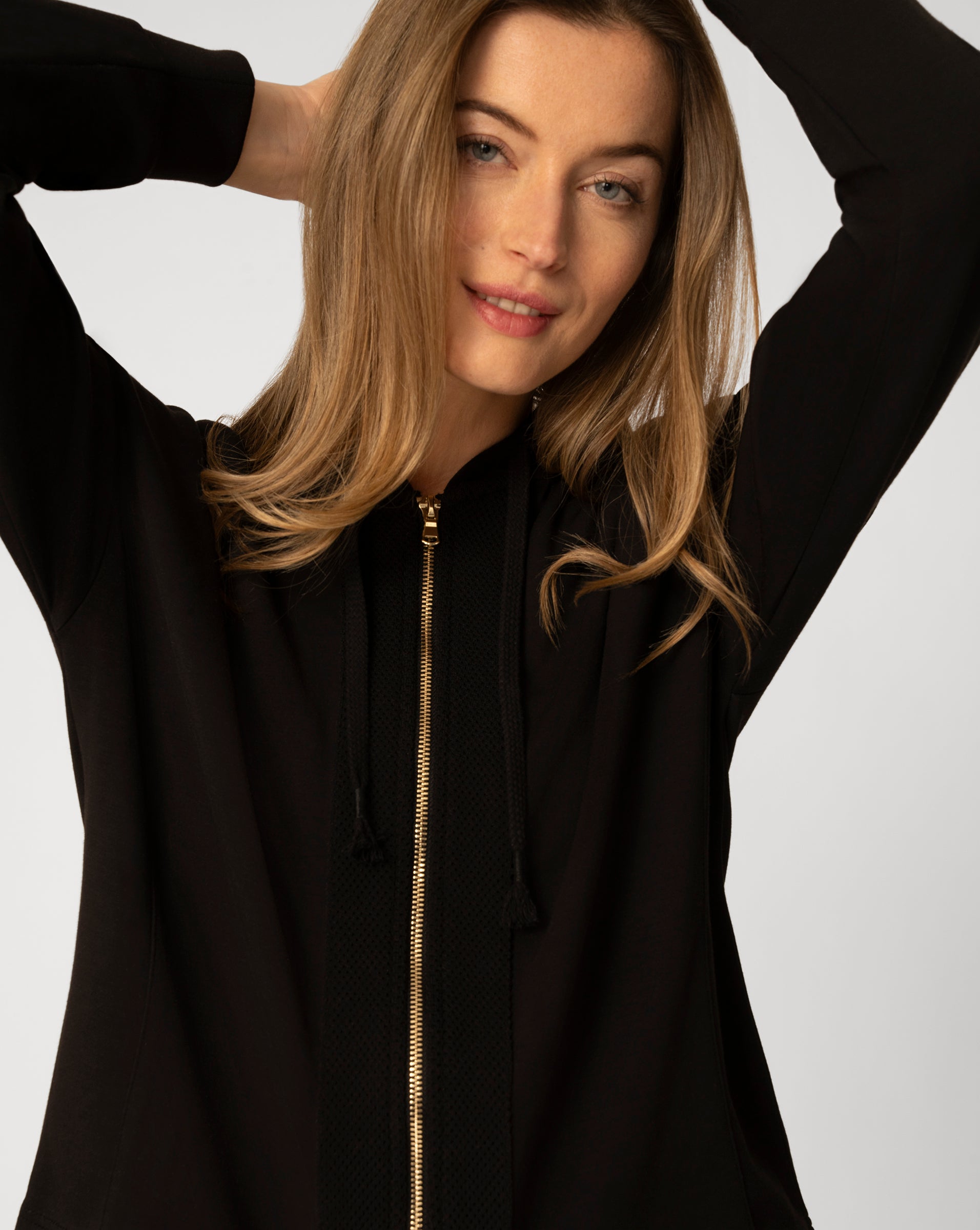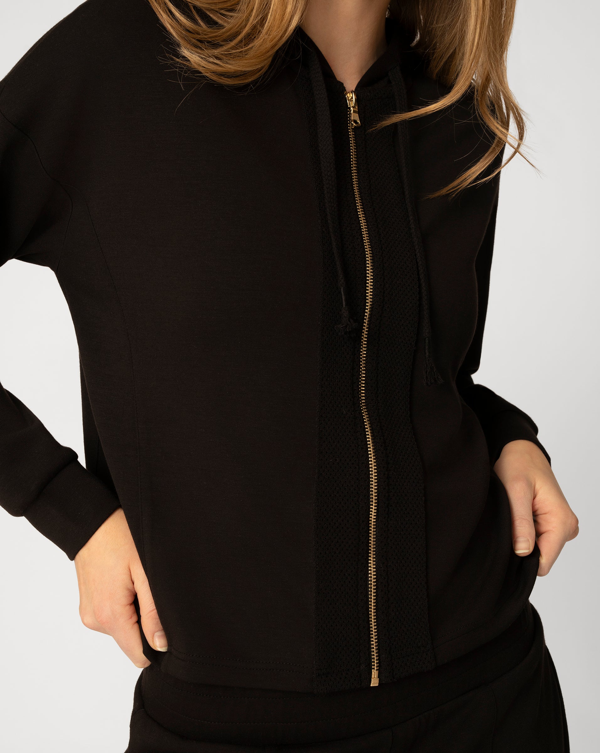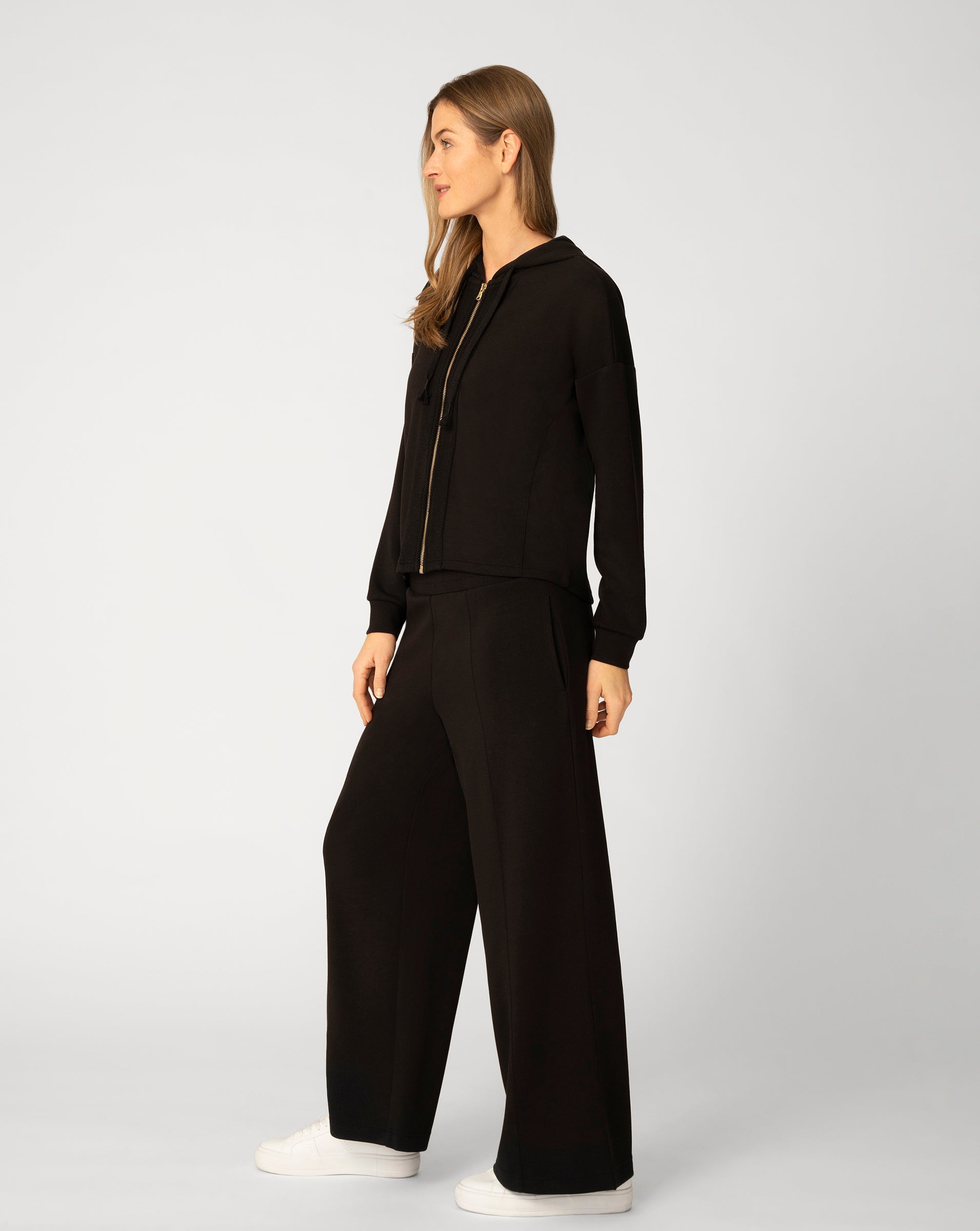 This two piece pant set brings together relaxed comfort and elevated detail. The zip front hoodie features a sporty silhouette accented with subtle crochet knit texture, while the matching wide leg pant offers an easy drape and a comfortable drawstring waistband. Crafted in a soft yummy modal blend with stretch, this set is designed for effortless wear that feels just as good as it looks, whether worn together or mixed into your everyday wardrobe.