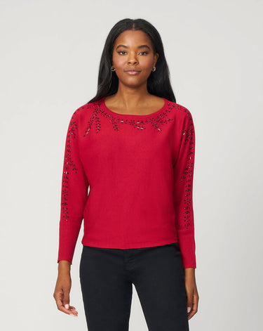 - Boat neck, long dolman sleeves, rhinestone detailing