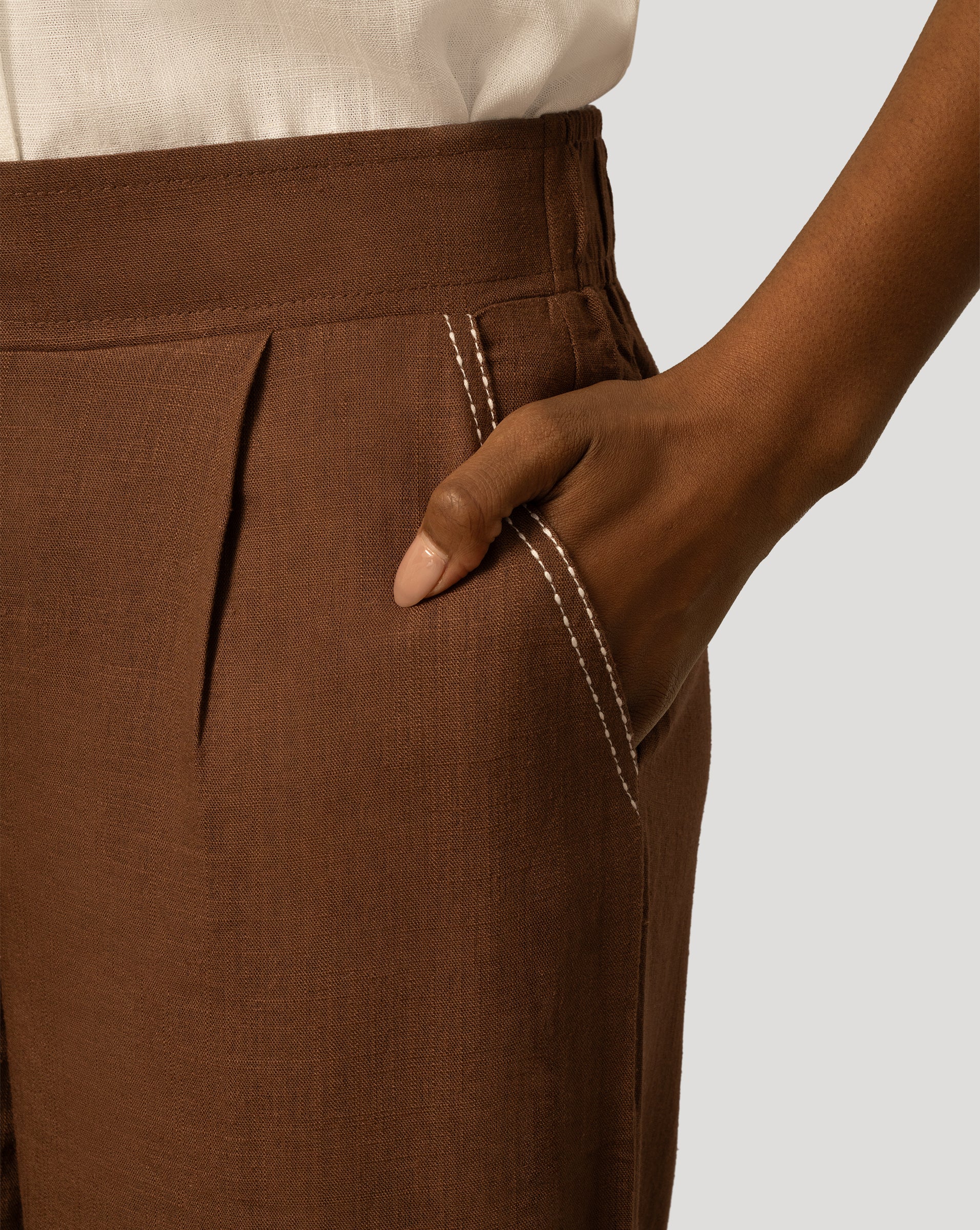 - Crosshatch linen blend, pleated front, slant pockets, contrast stitching