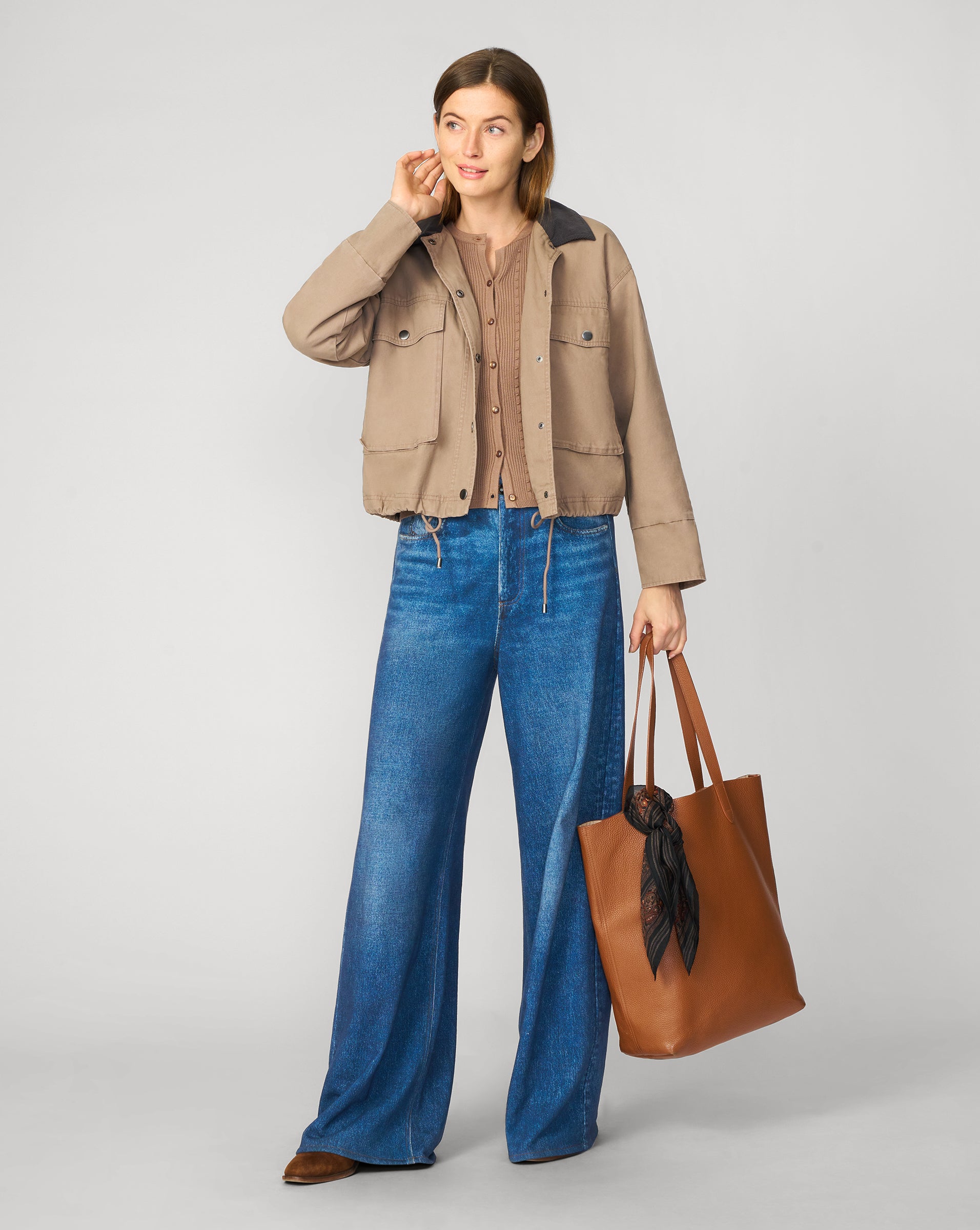 This cropped barn jacket combines casual style with comfort. Crafted from 100% cotton, it features a soft corduroy combo collar and metal snap closure for a polished look. The jacket is fully lined with a printed interior and includes a drawstring for added versatility. With its slightly oversized fit, it hits at the waist, making it perfect for layering over casual outfits or dressing up your look.