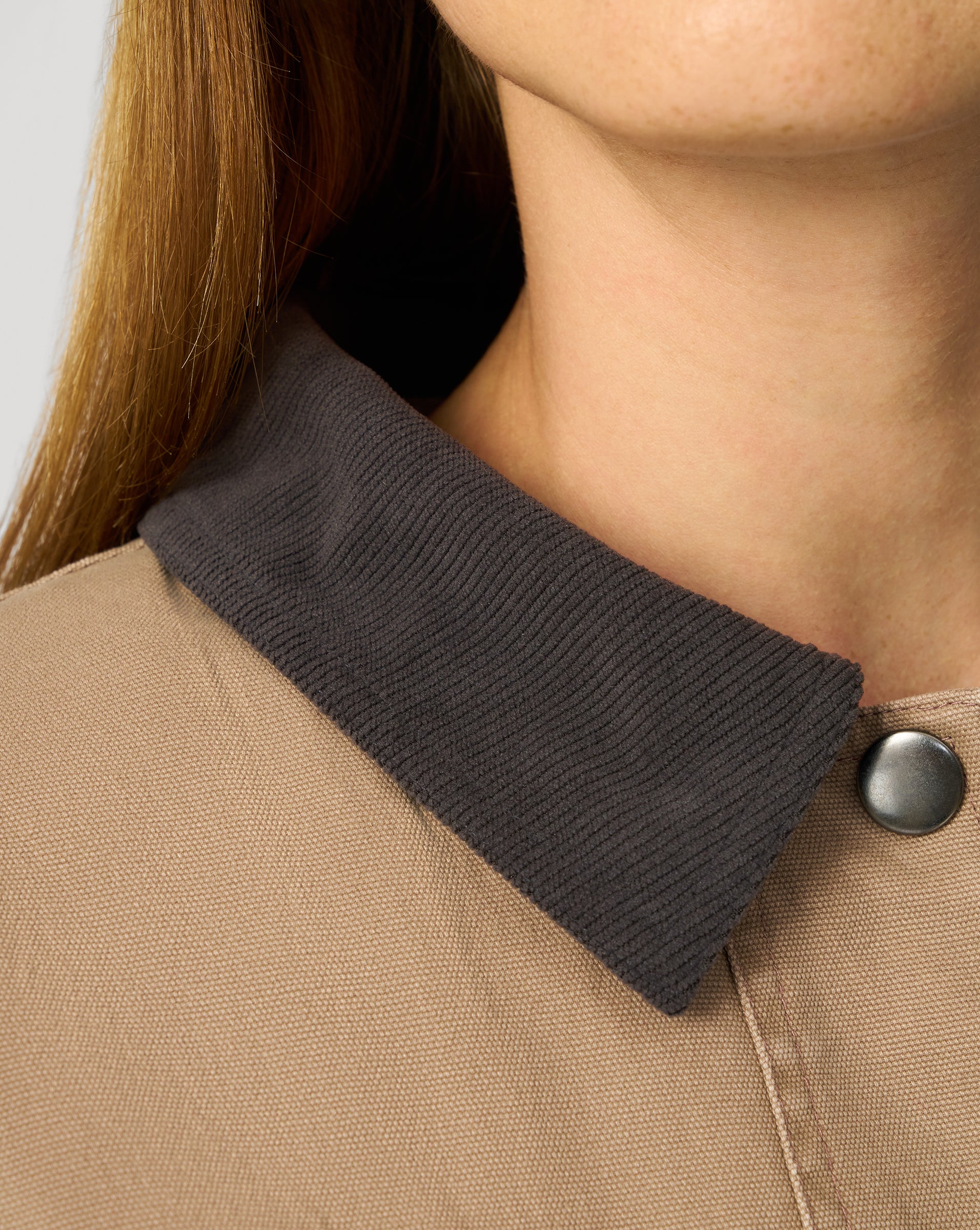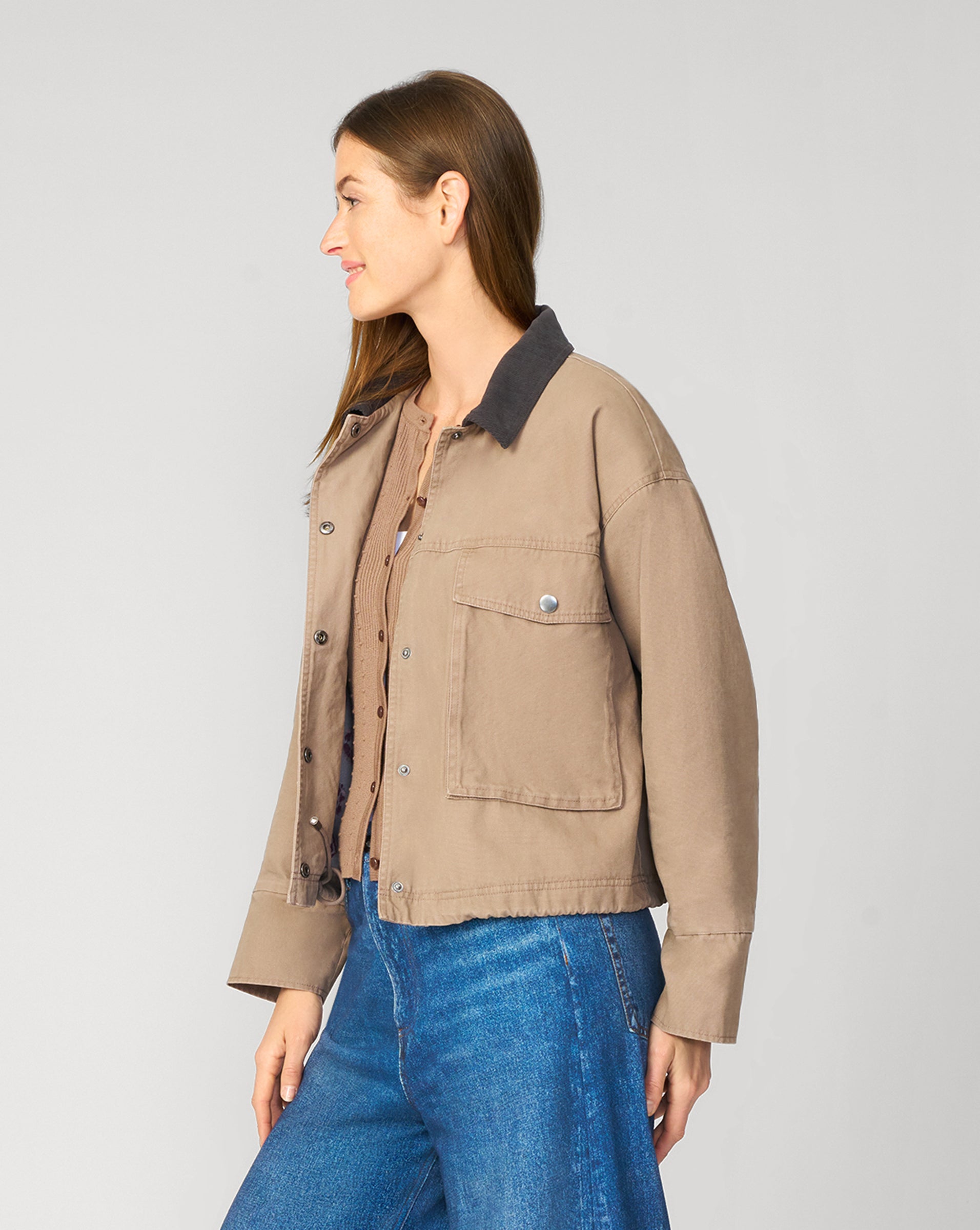 - Cropped, fully lined barn jacket with soft corduroy collar and snap closure