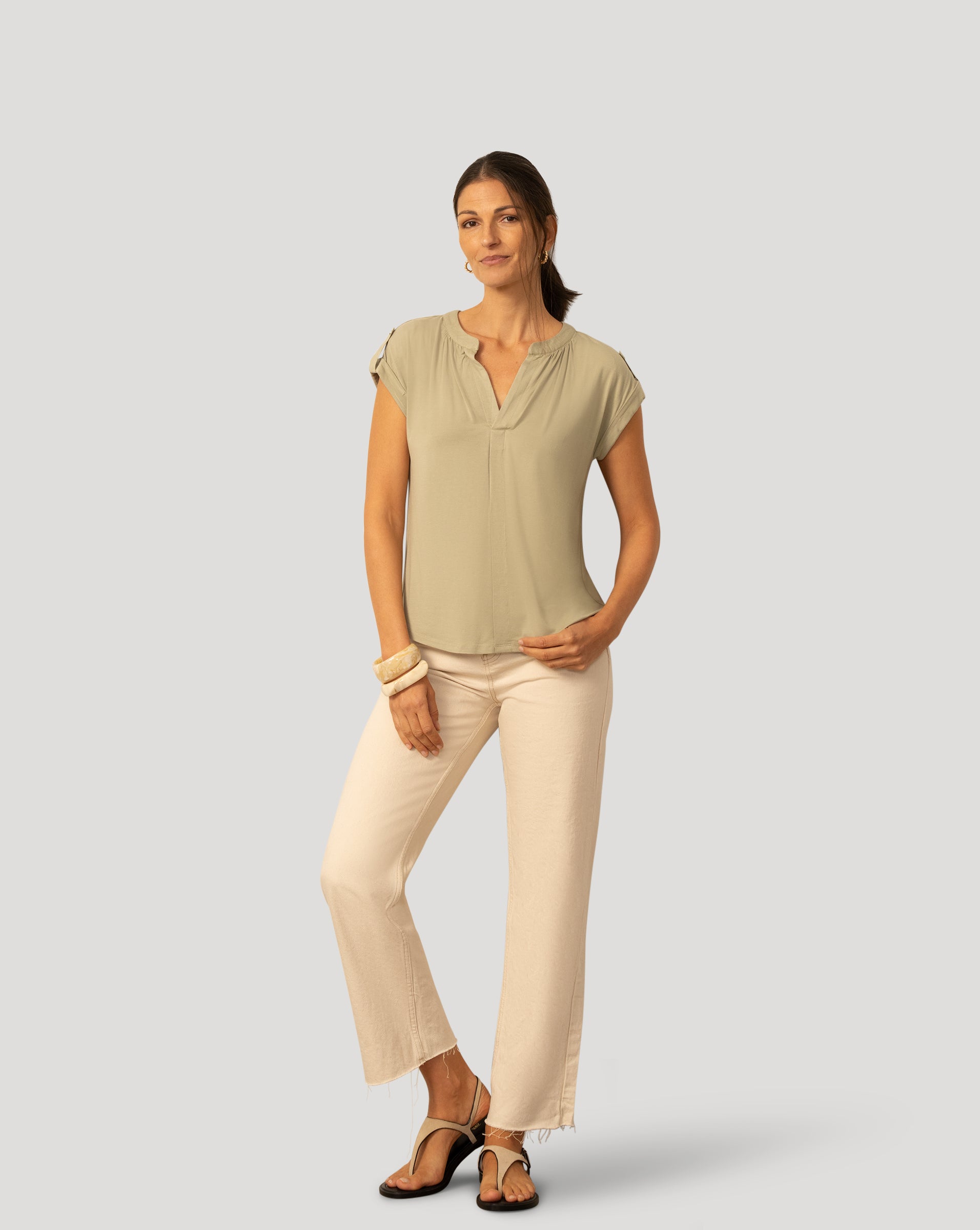 A polished warm weather top designed for effortless everyday style. Crafted from smooth rayon span fabric with a touch of stretch, it feels lightweight and comfortable while maintaining a clean, refined look. The split neckline adds modern simplicity, while the extended shoulders provide flattering coverage. Tab detailing at the sleeves offers an elevated finishing touch, making this an easy piece to dress up or down all season long.