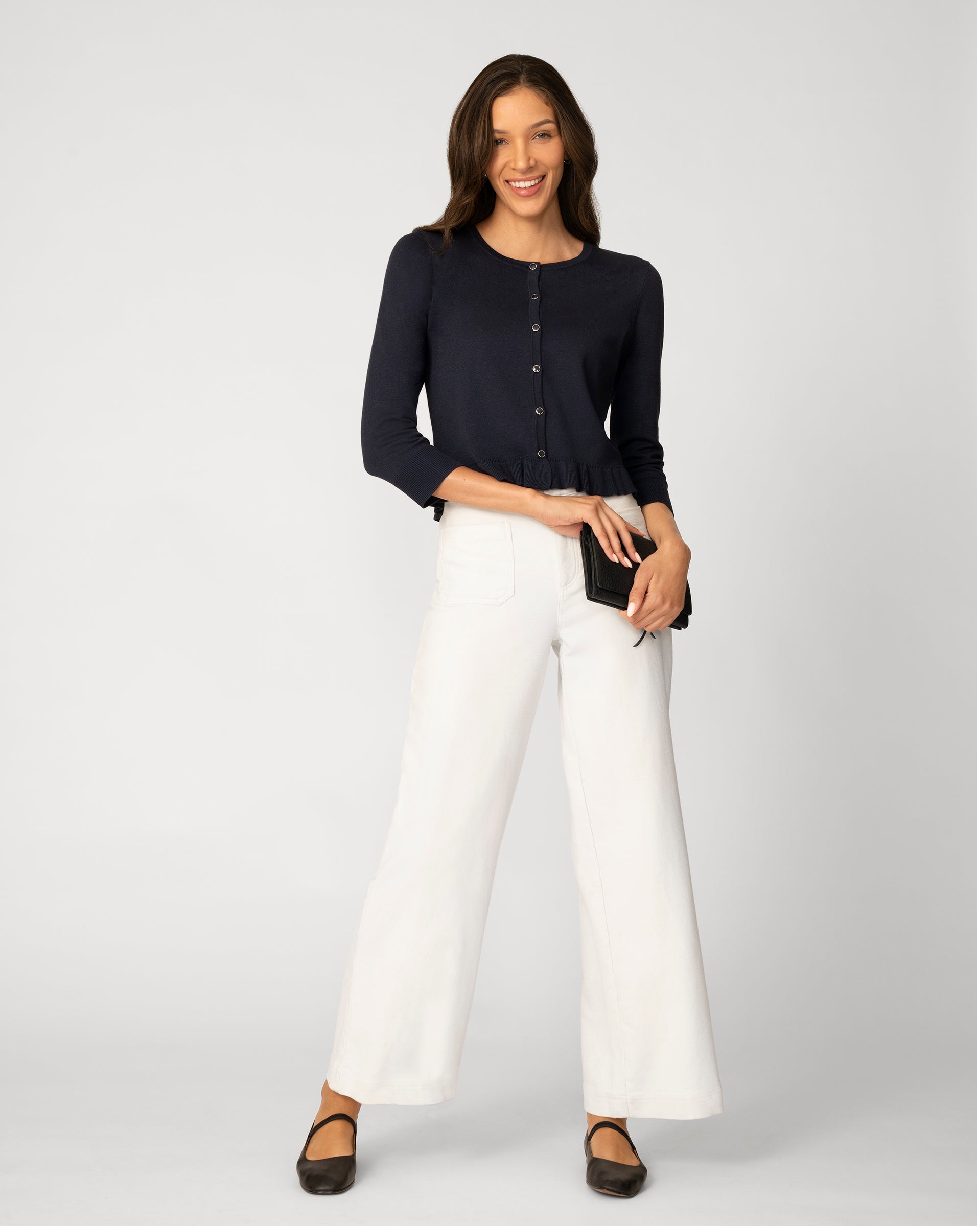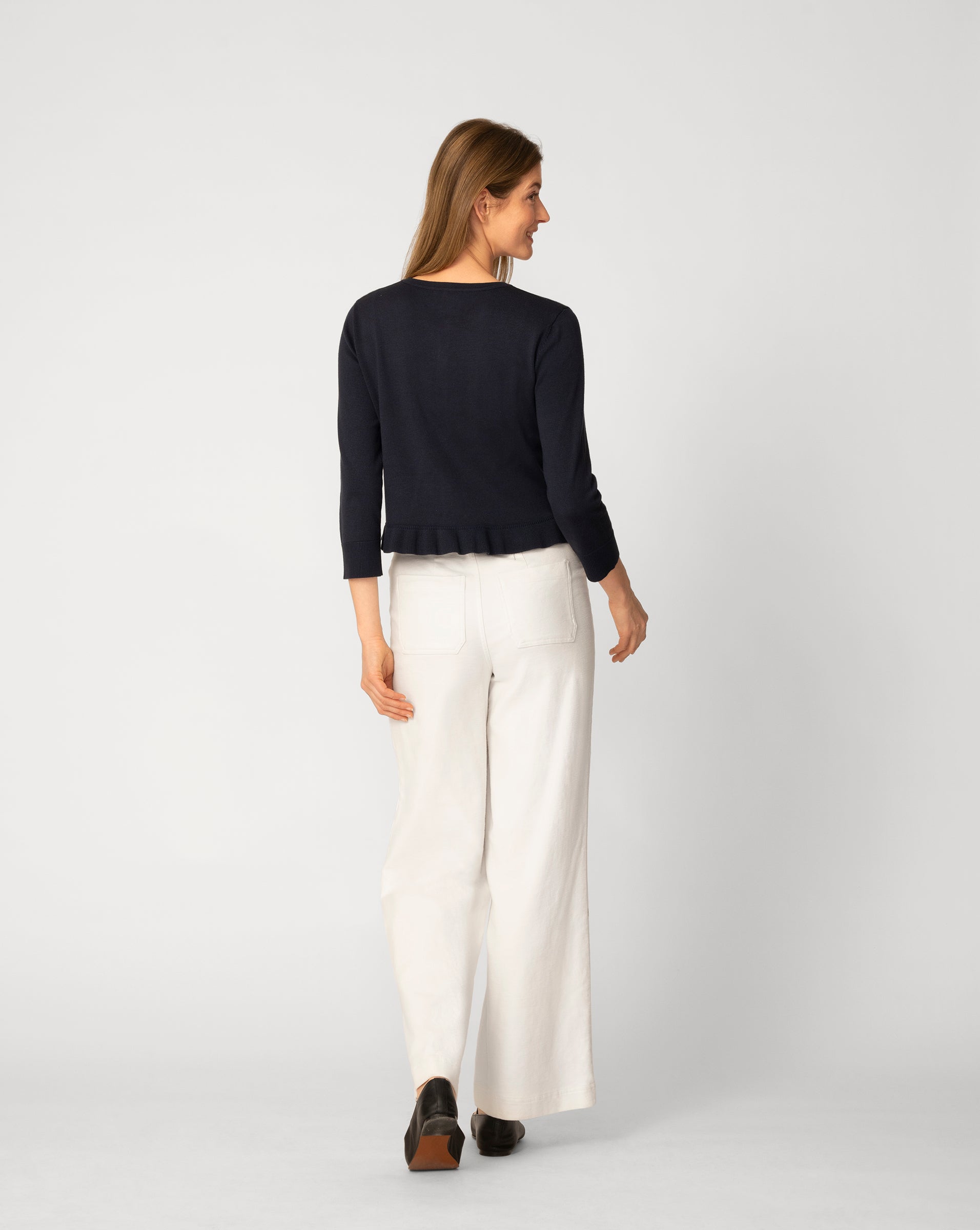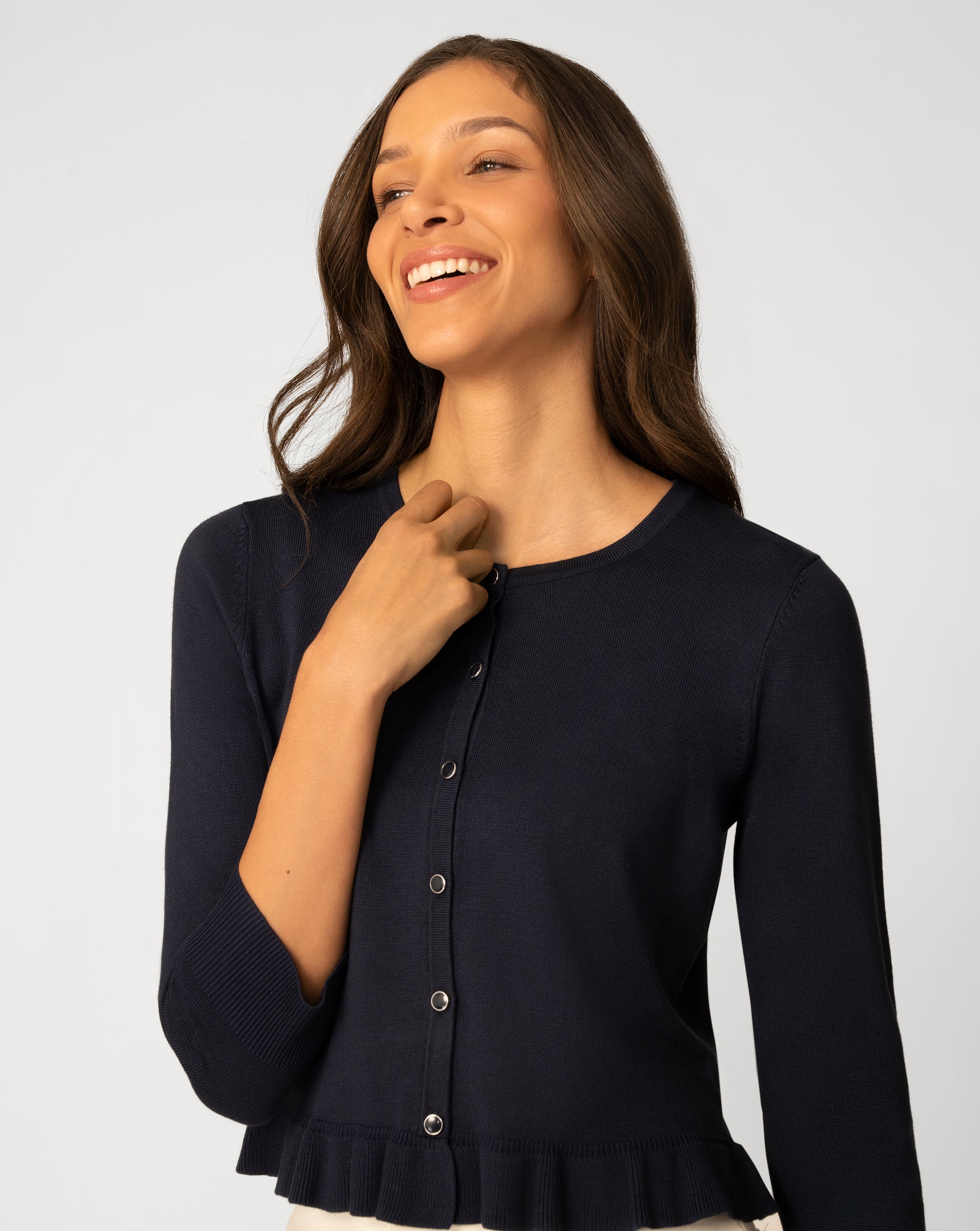 - 3/4 long sleeve, crew neck, button front cardigan, ruffled rib hem