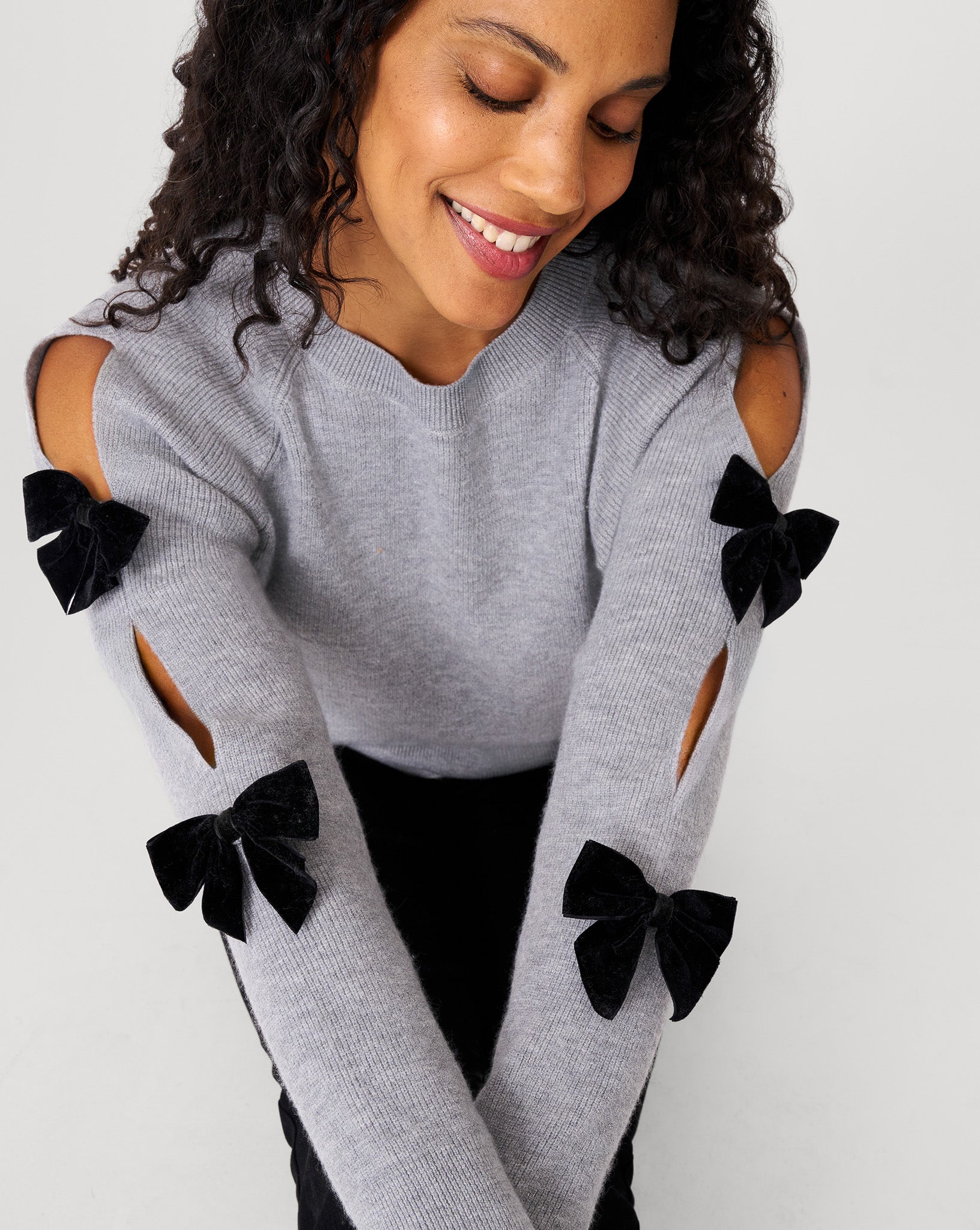 - Crew neck, long sleeves, cut-out sleeves, velvet bow accents