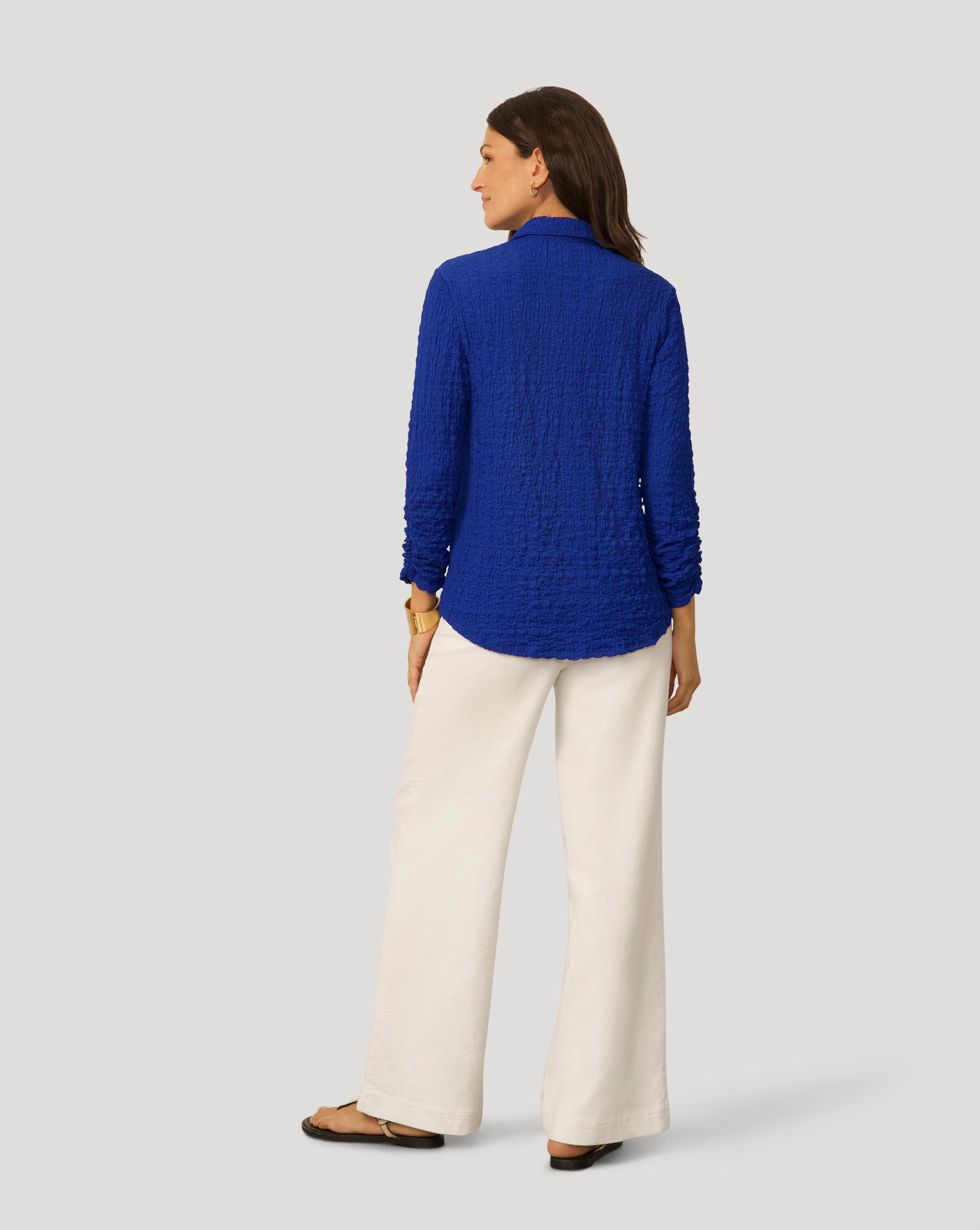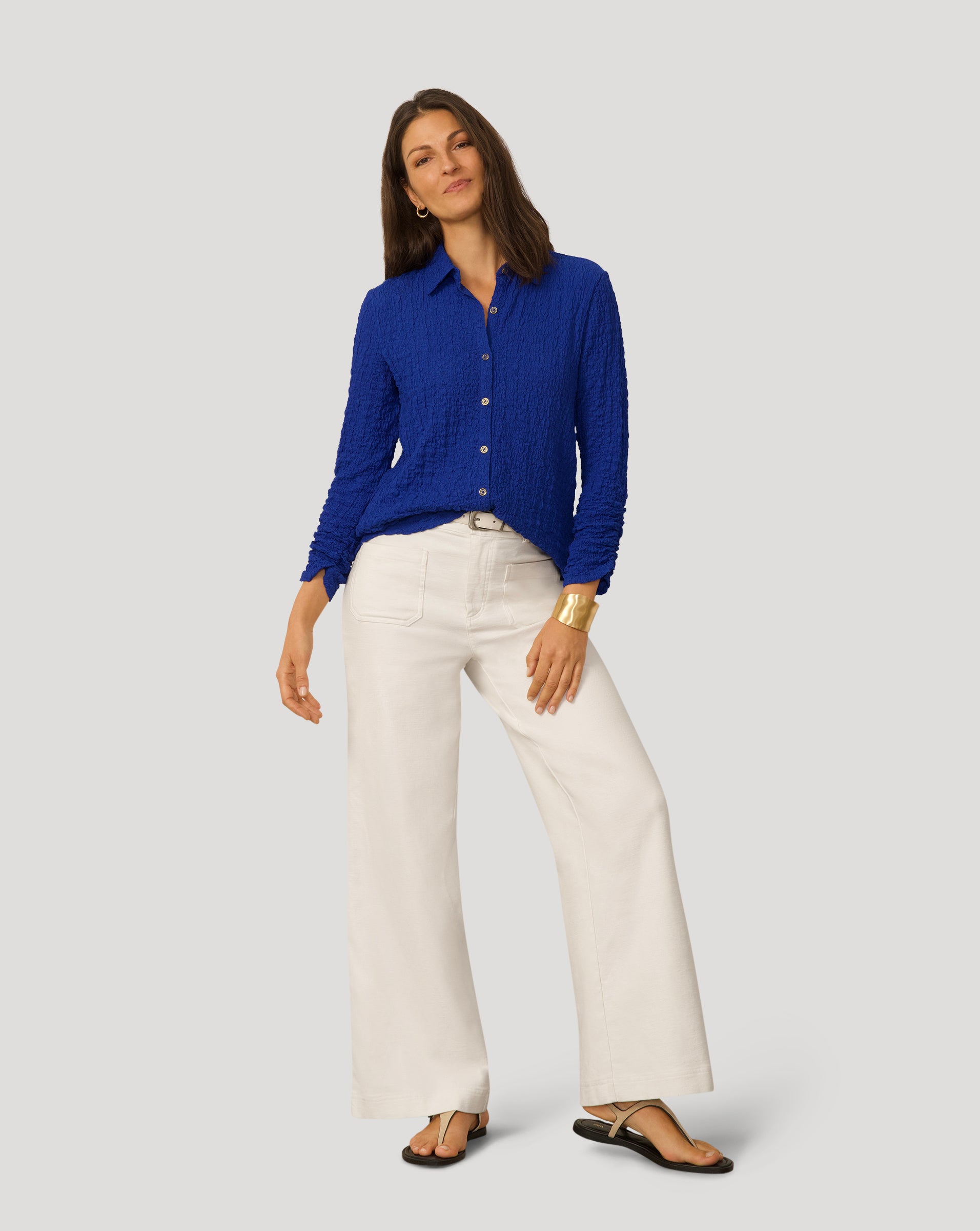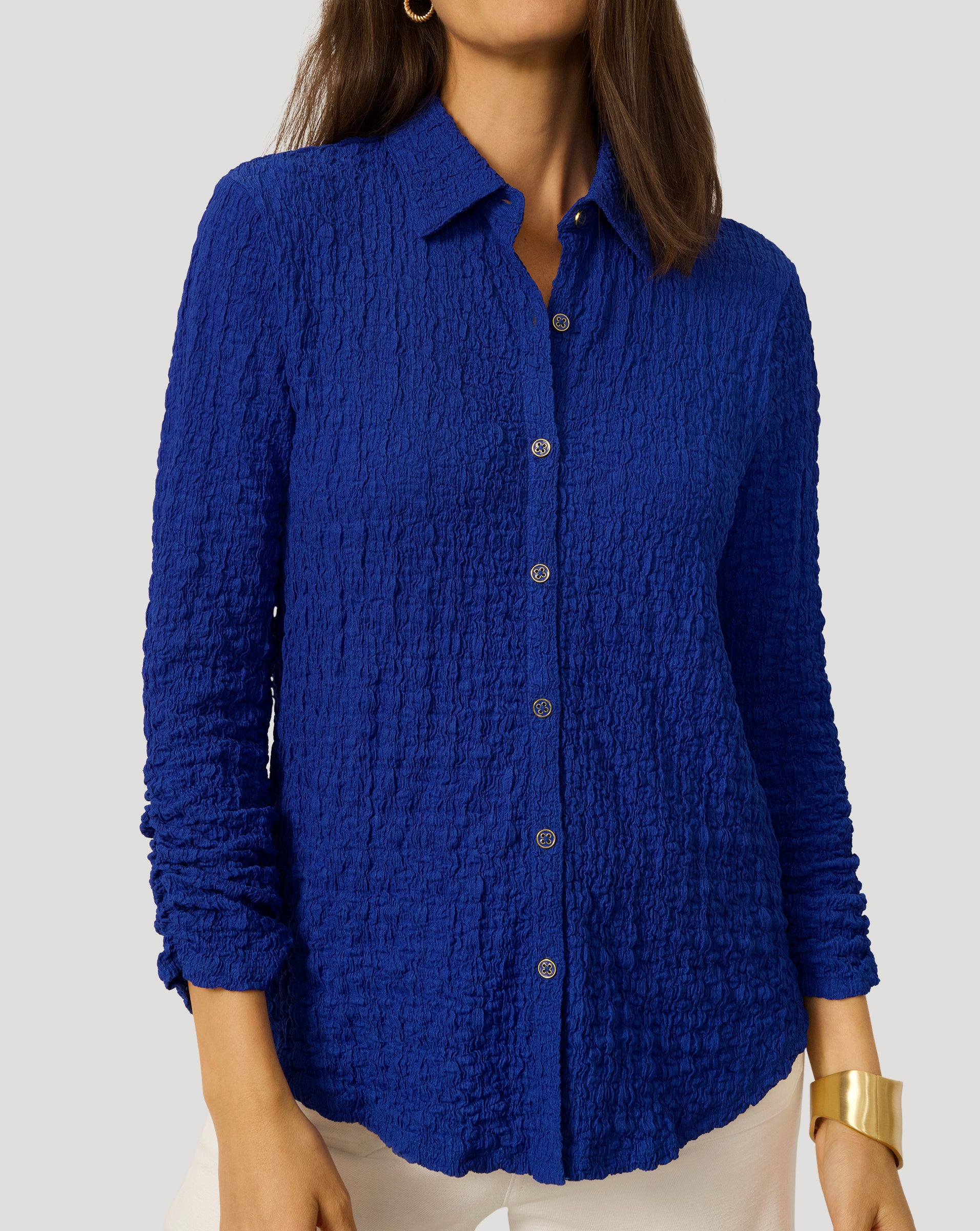 • Classic button front, 3/4 ruched sleeves, shirttail hem