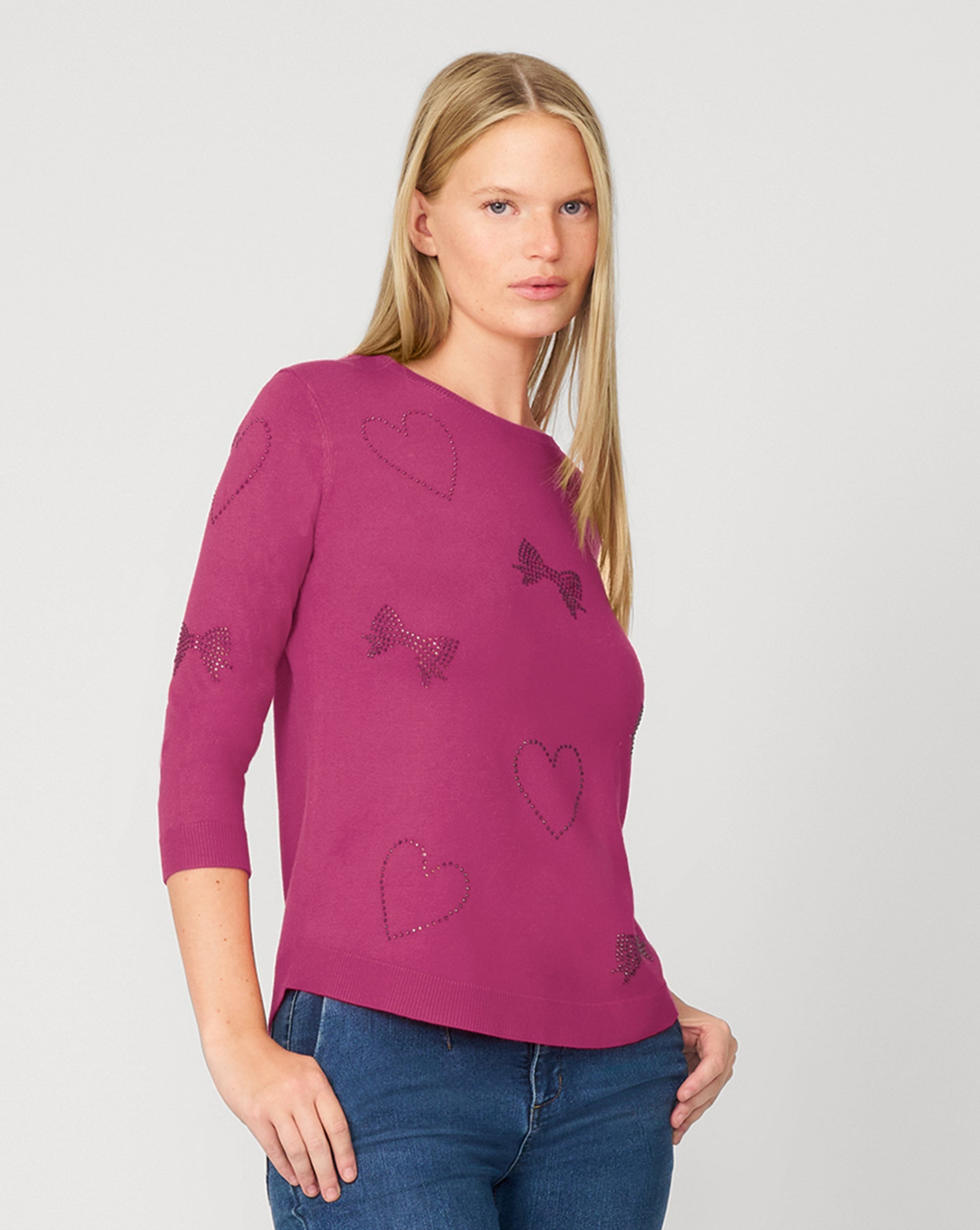• Boat neck, 3/4 sleeves, rhinestone heart and bow detailing