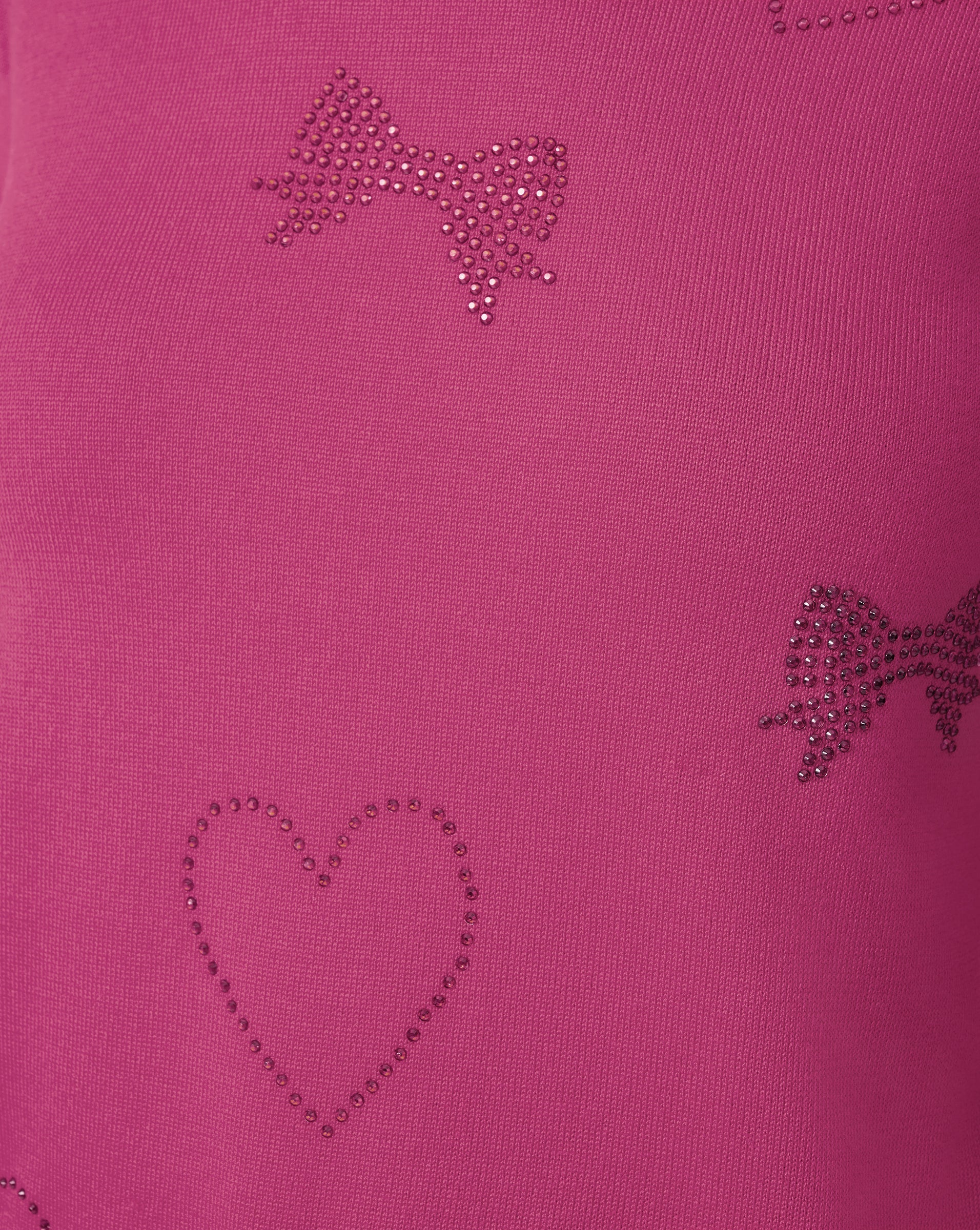 A soft knit top that sparkles with playful hotfix heart and bow accents for a touch of feminine shine. Designed with a rounded hem and 3/4 sleeves, it offers a flattering silhouette that’s easy to layer and perfect for everyday romance. Lightweight and comfortable, it’s a charming piece that adds warmth and personality to any look.