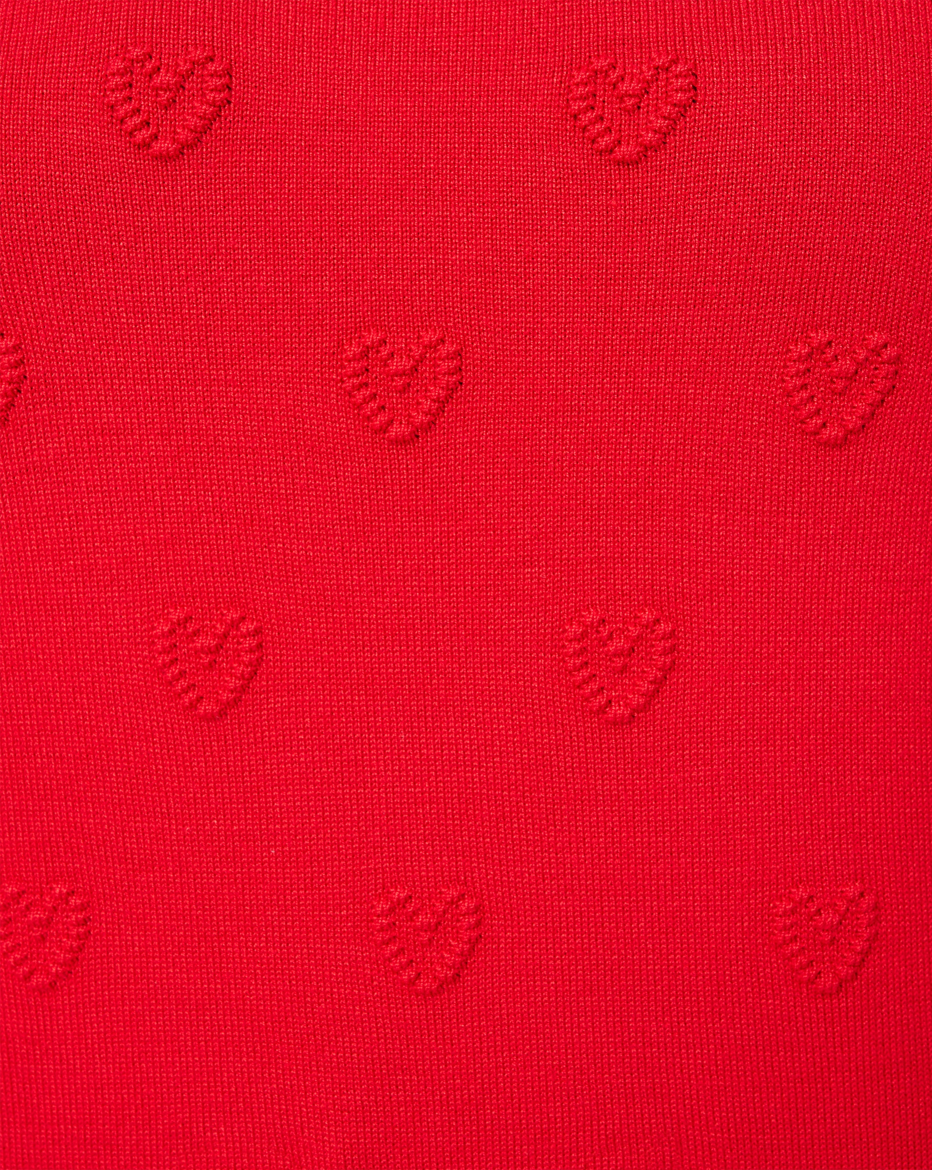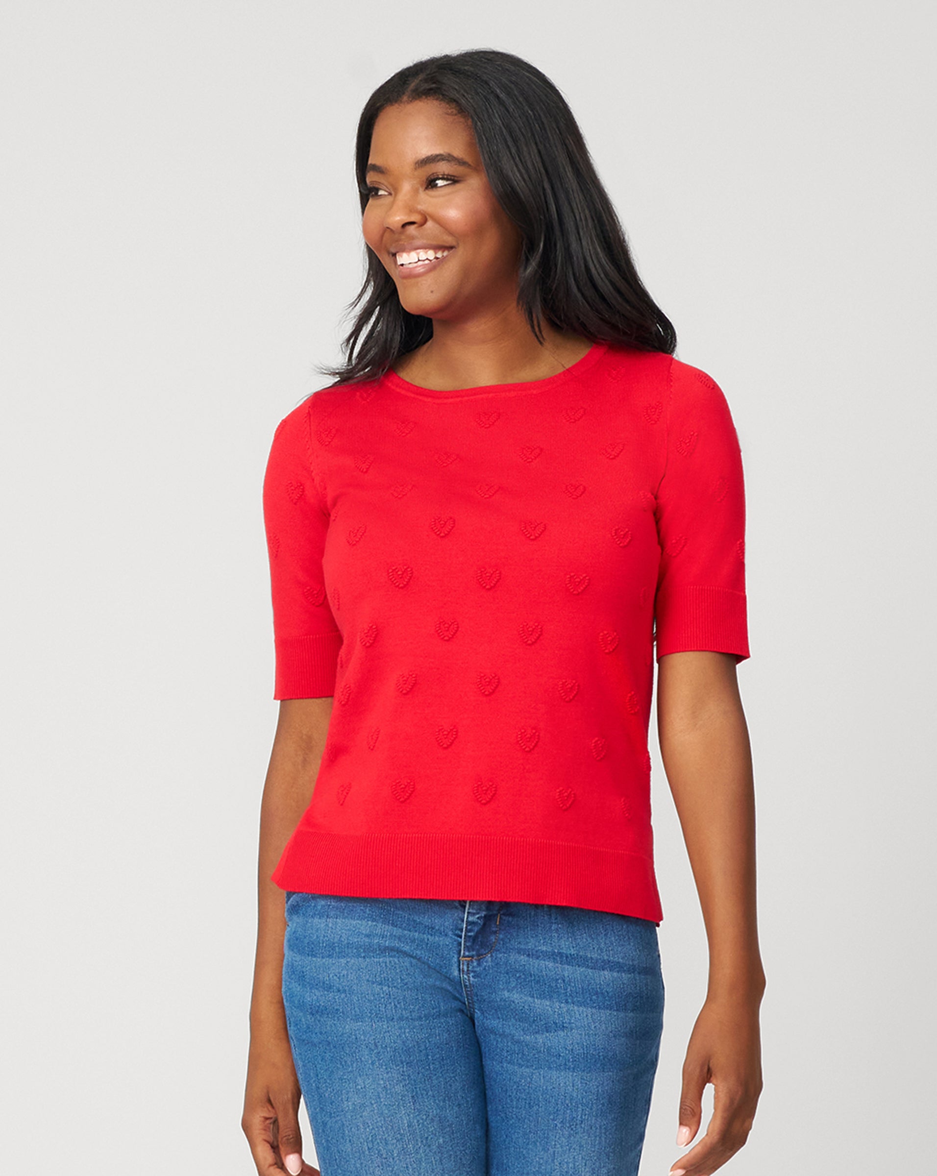 - Boat neck, elbow sleeves, raised heart stitch detailing