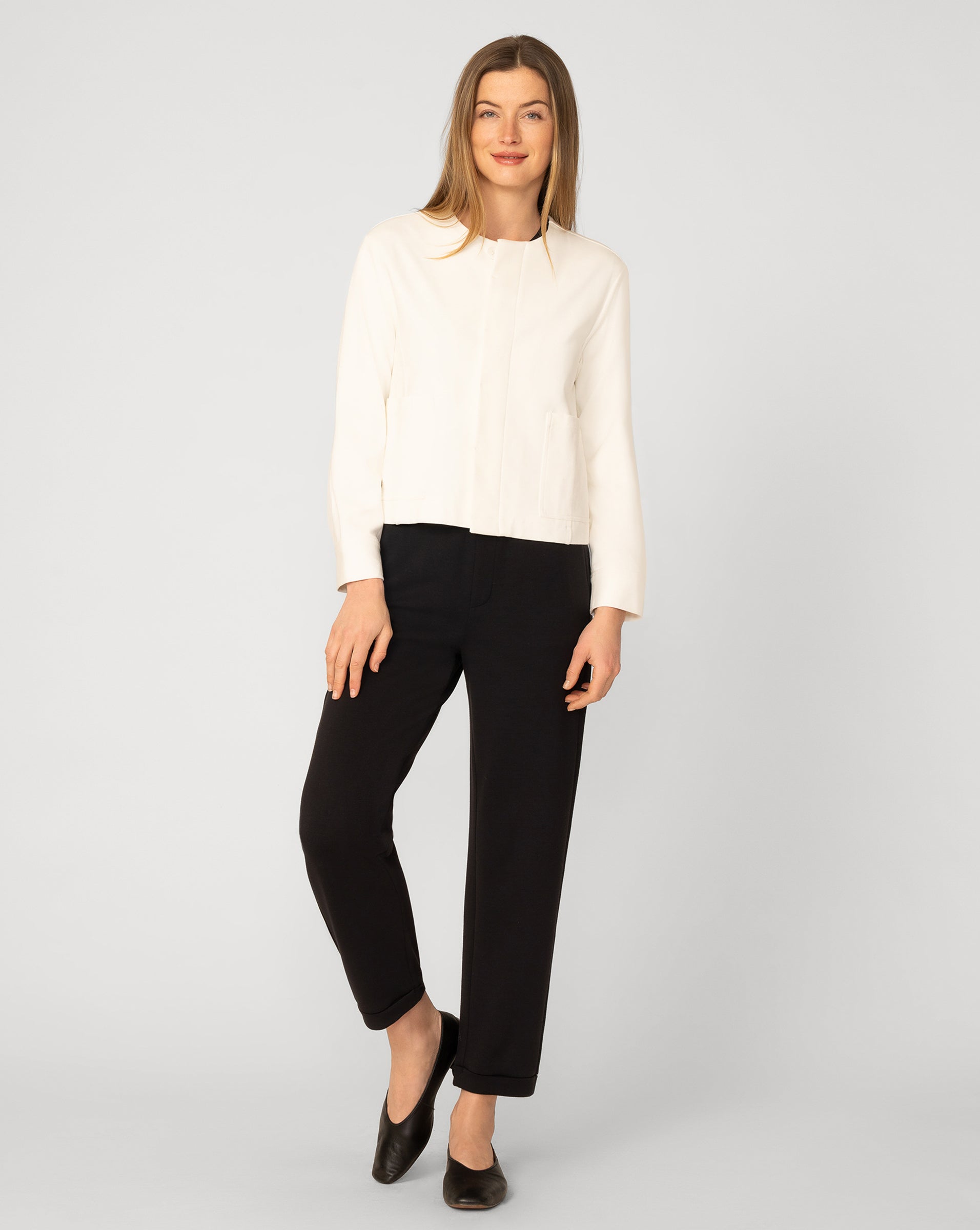 This modern jacket is crafted in a structured ponte knit that offers a smooth, comfortable feel with polished shape. Designed with a relaxed fit, it features hidden button closures and functional patch pockets for a clean, streamlined look. An easy layering piece that elevates everyday outfits with effortless sophistication.