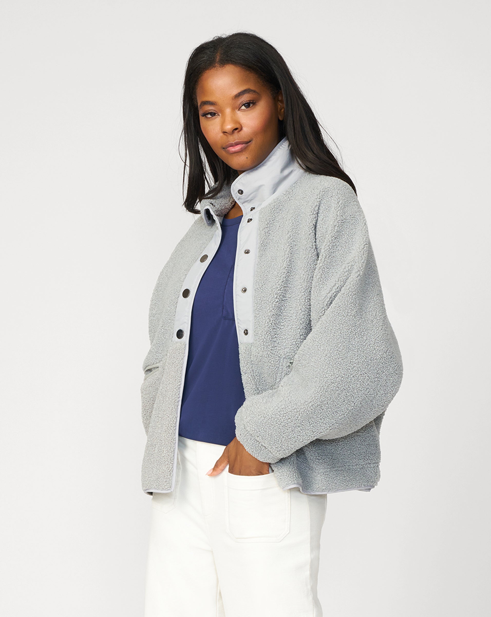 - Snap front Fleece Jacket, Stand Collar, Pockets