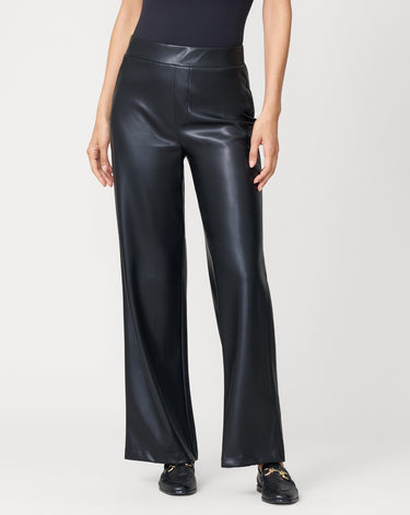 - Soft, vegan leather pant with comfortable pull on waistband and stylish wide leg