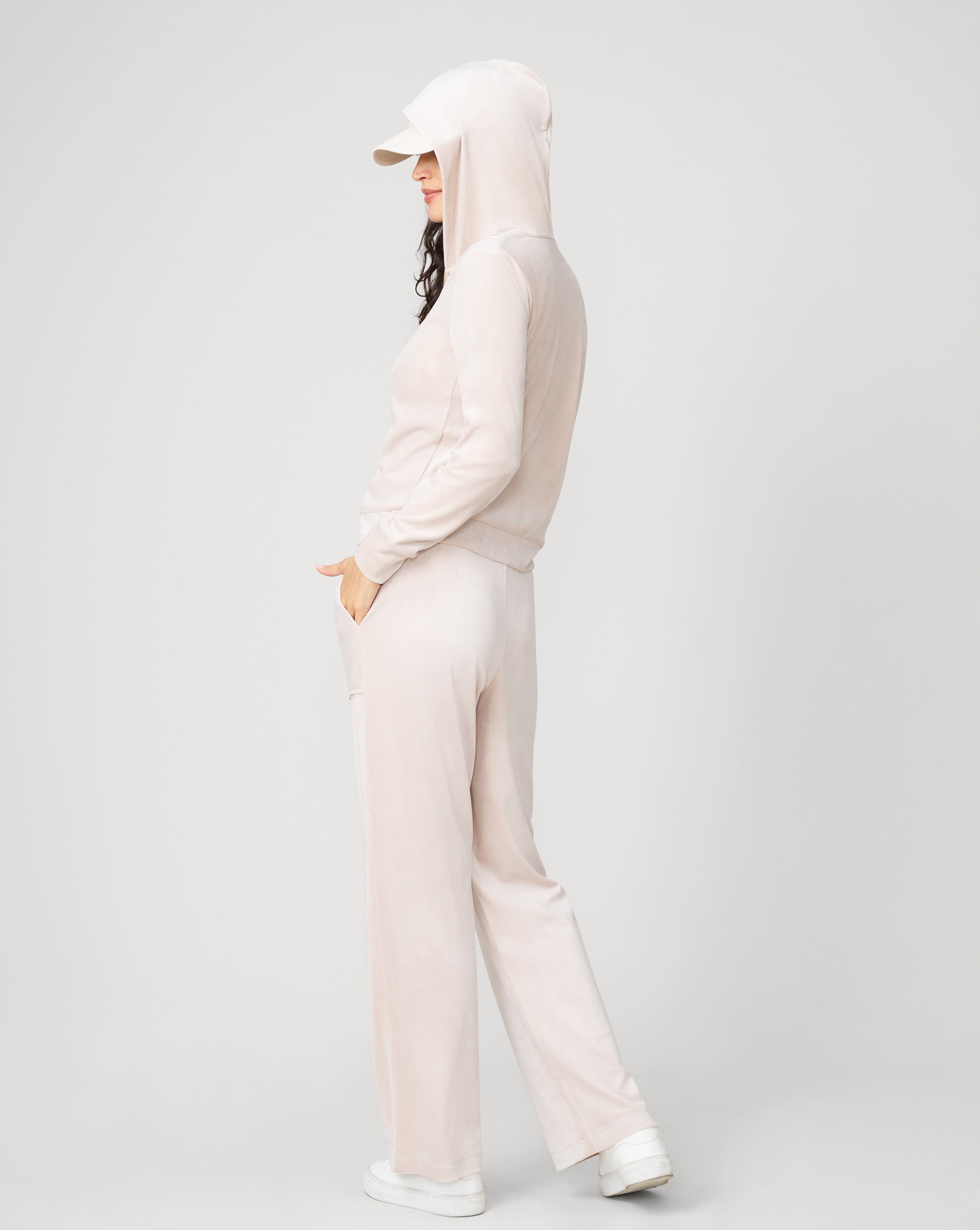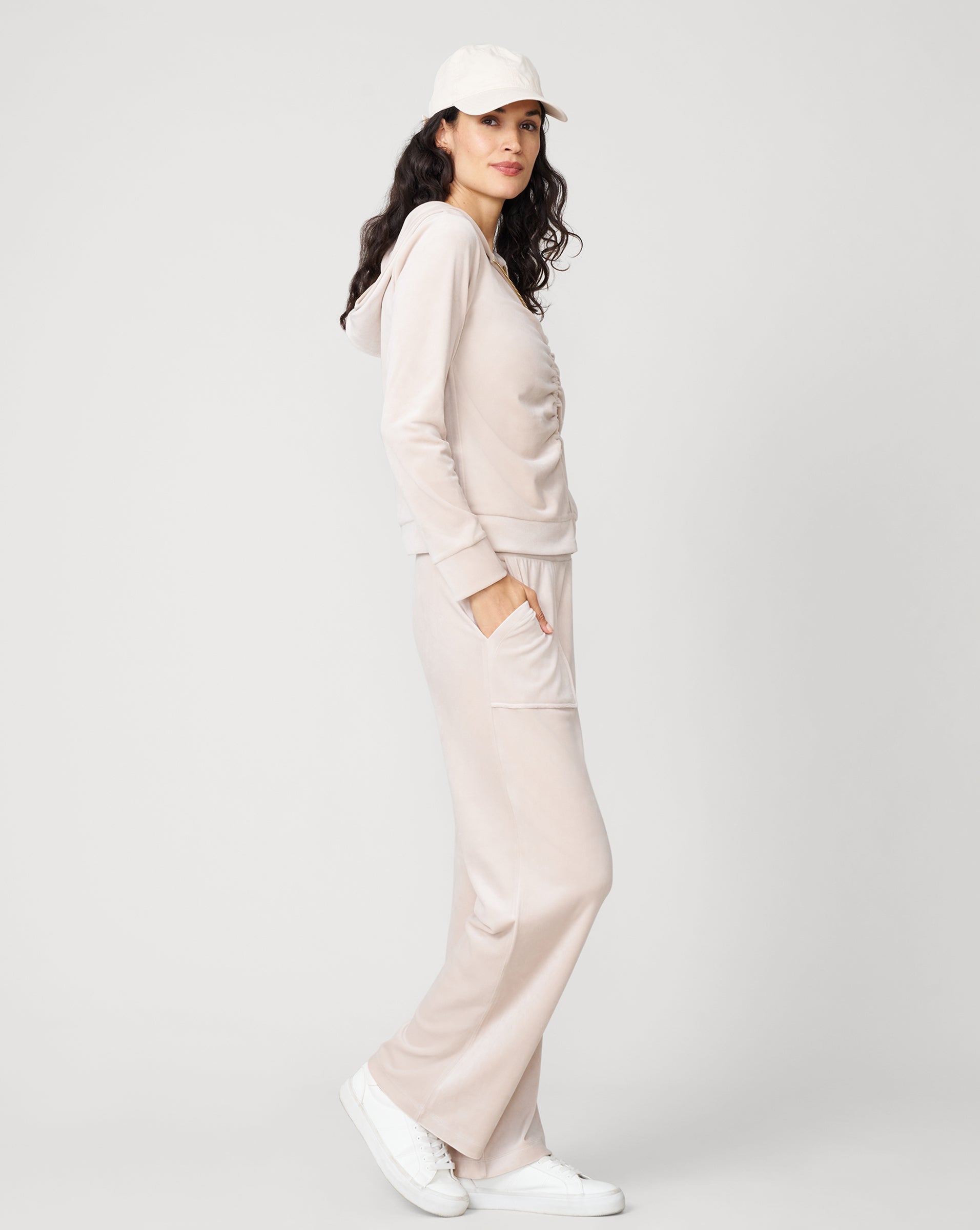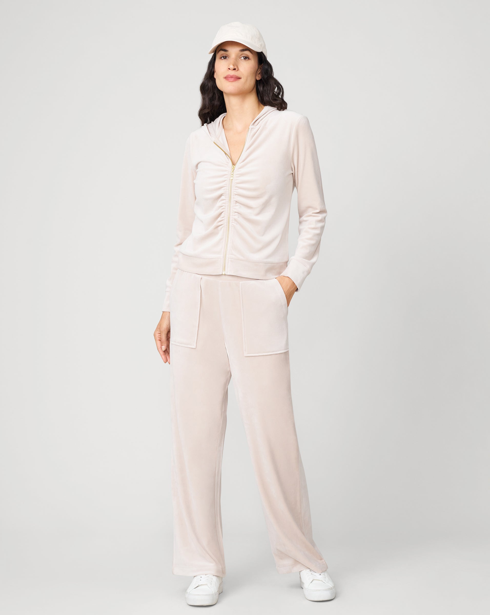 - Long sleeve zip up hoodie with ruched detailing. Full length pants with an elastic waistband and pockets.