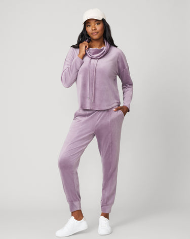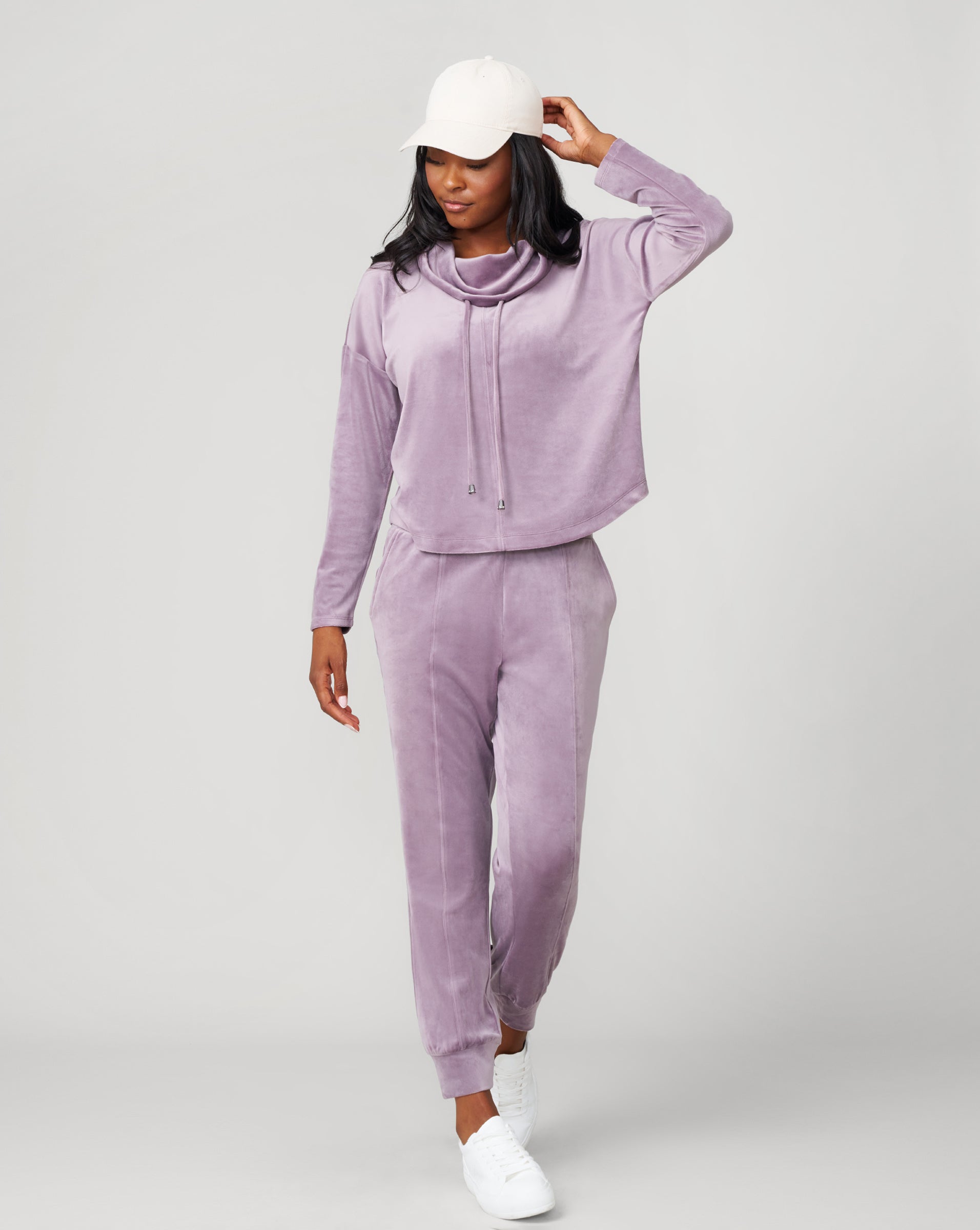 Wrap yourself in the plush softness of this velour jogger set, designed for effortless comfort and polish. The cowlneck top features a relaxed fit and elevated neckline, while the matching joggers offer ease with an elastic waistband. Crafted from soft velour fabric, it’s perfect for lounging at home or casual outings. Available in rich seasonal shades including jet black, grape wine, empherea, and navy blazer.