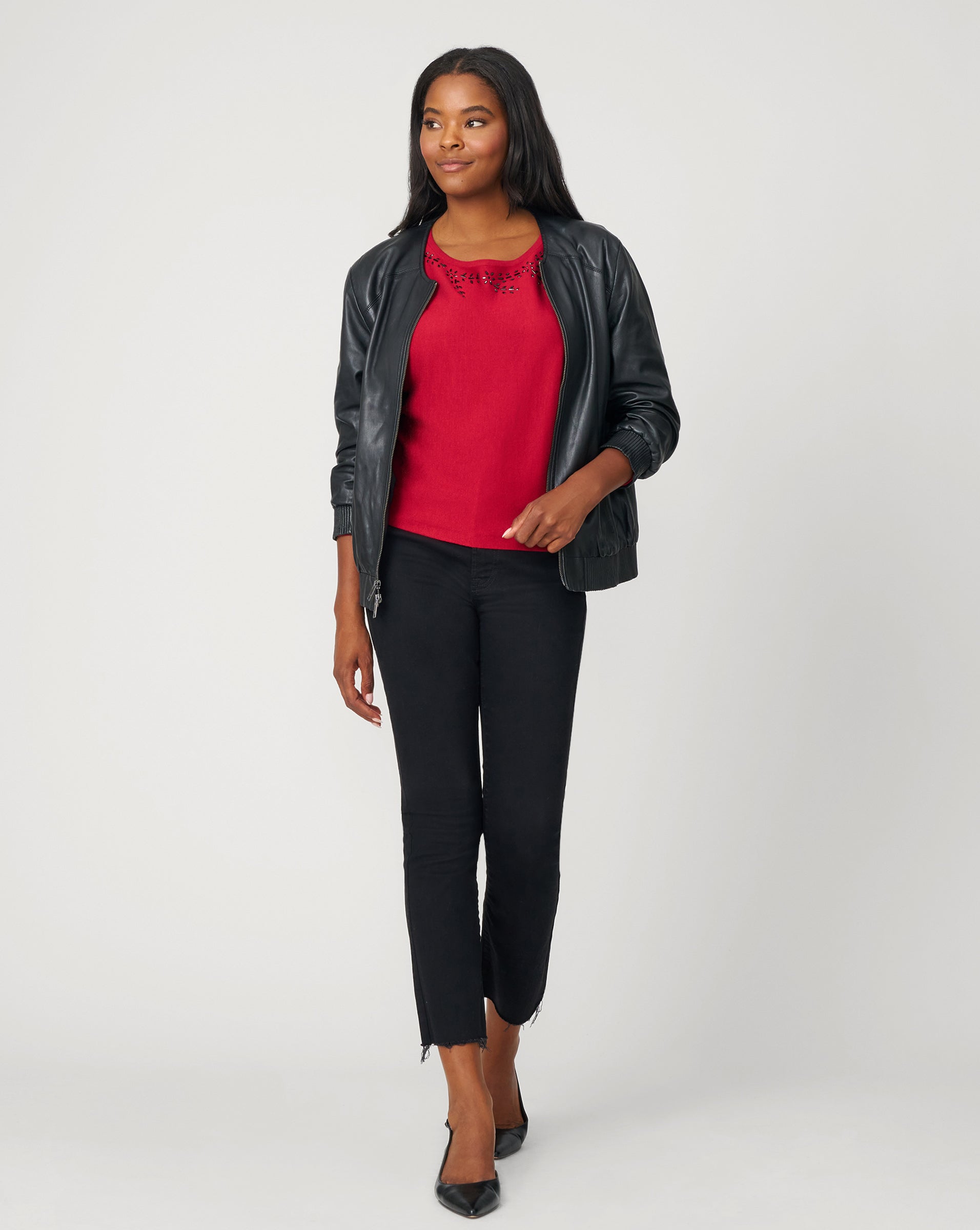 - Boat neck, long dolman sleeves, rhinestone detailing