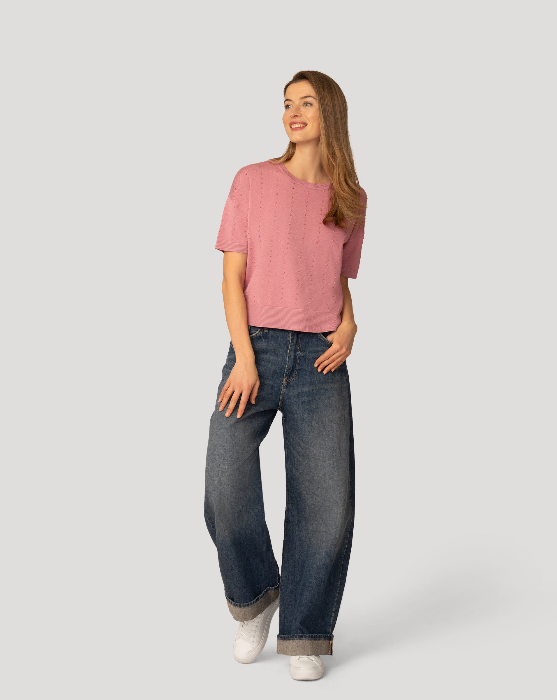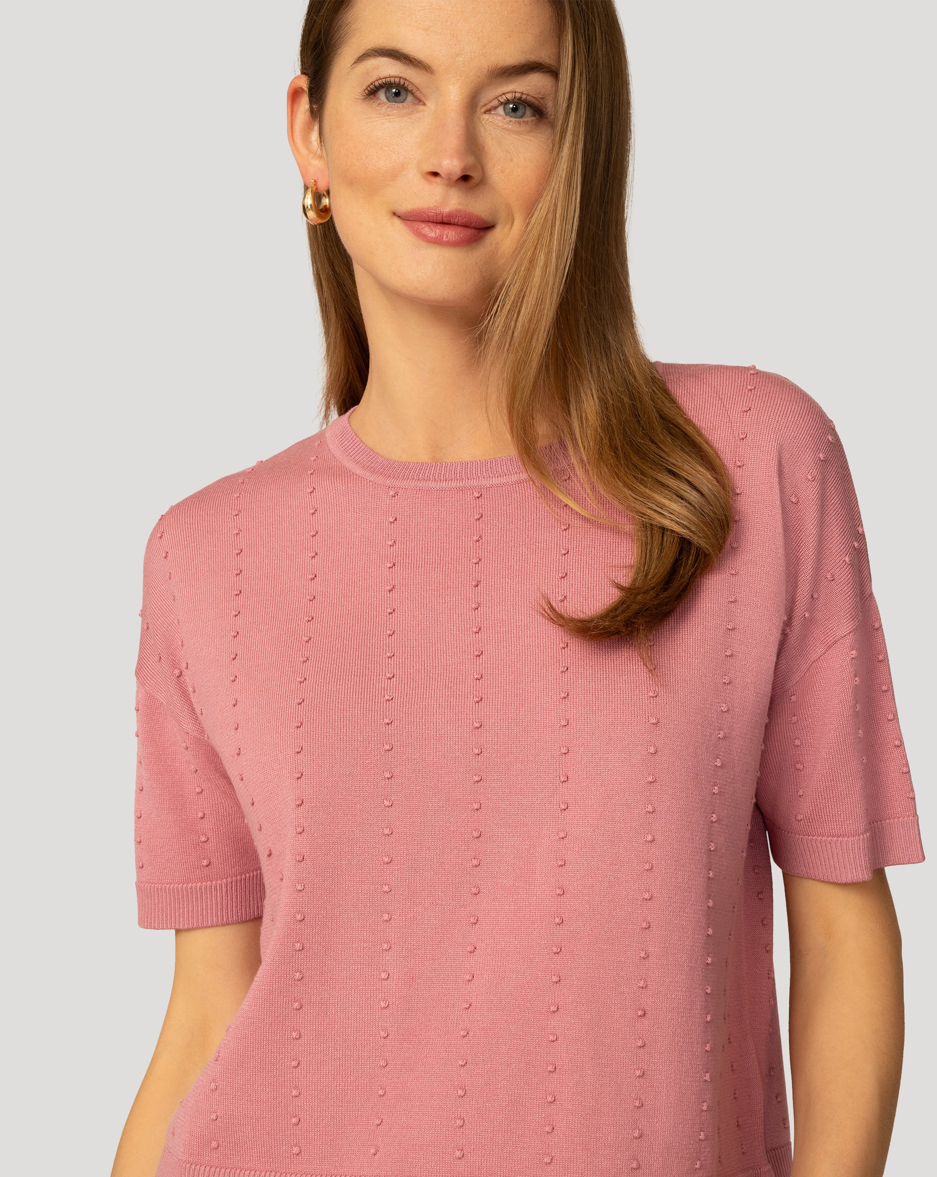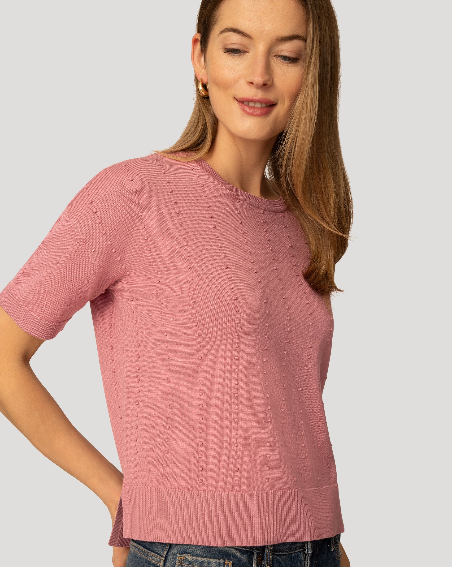 - Crewneck, short sleeve, textured stripe stitch, side slit at hem