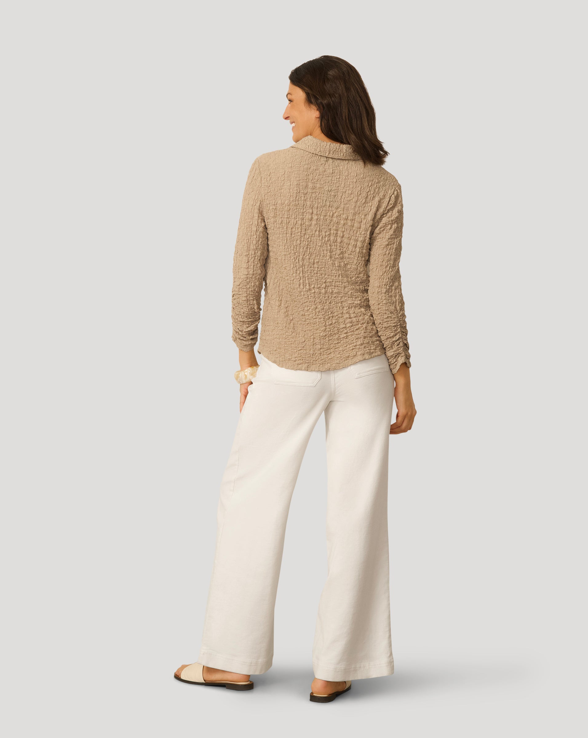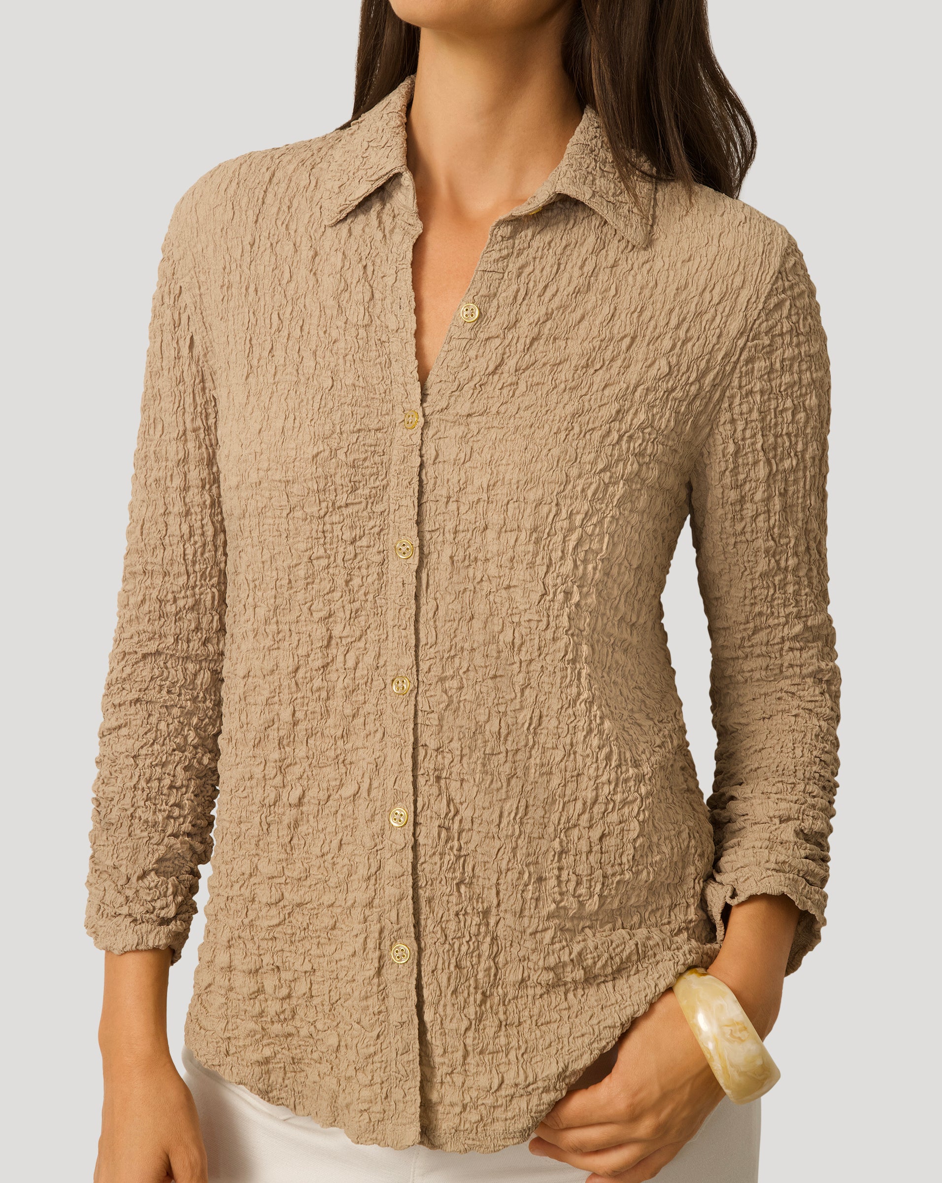 • Classic button front, 3/4 ruched sleeves, shirttail hem