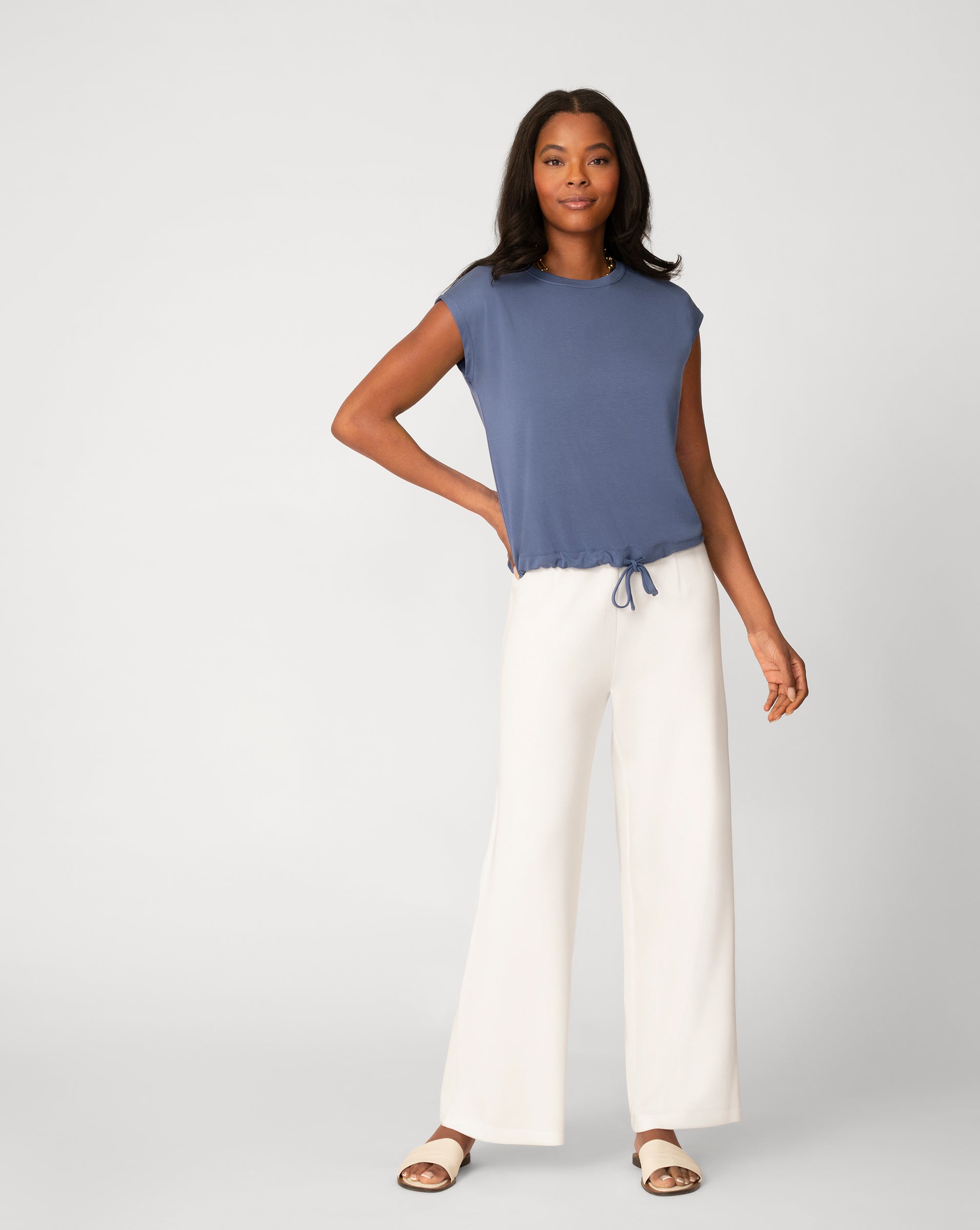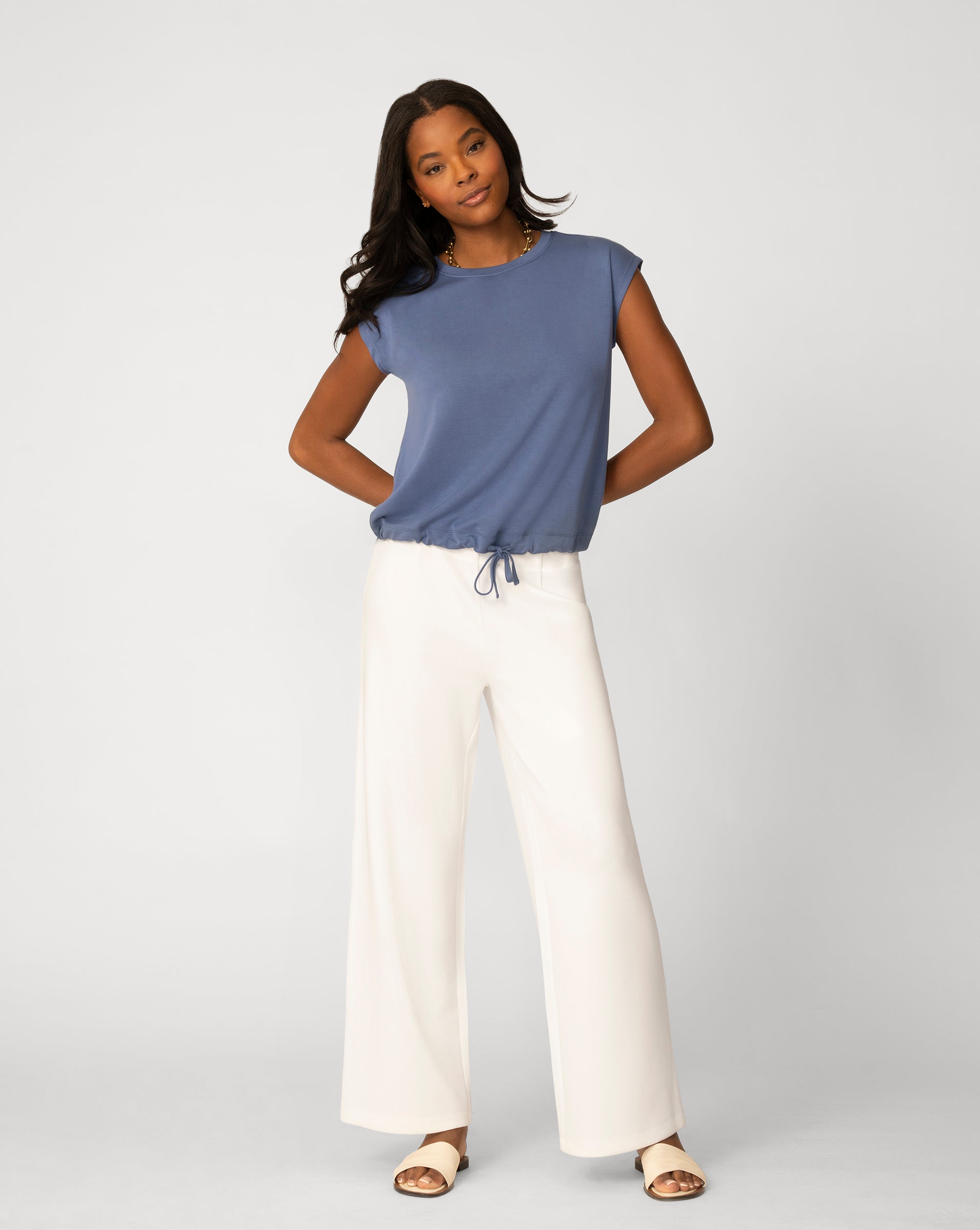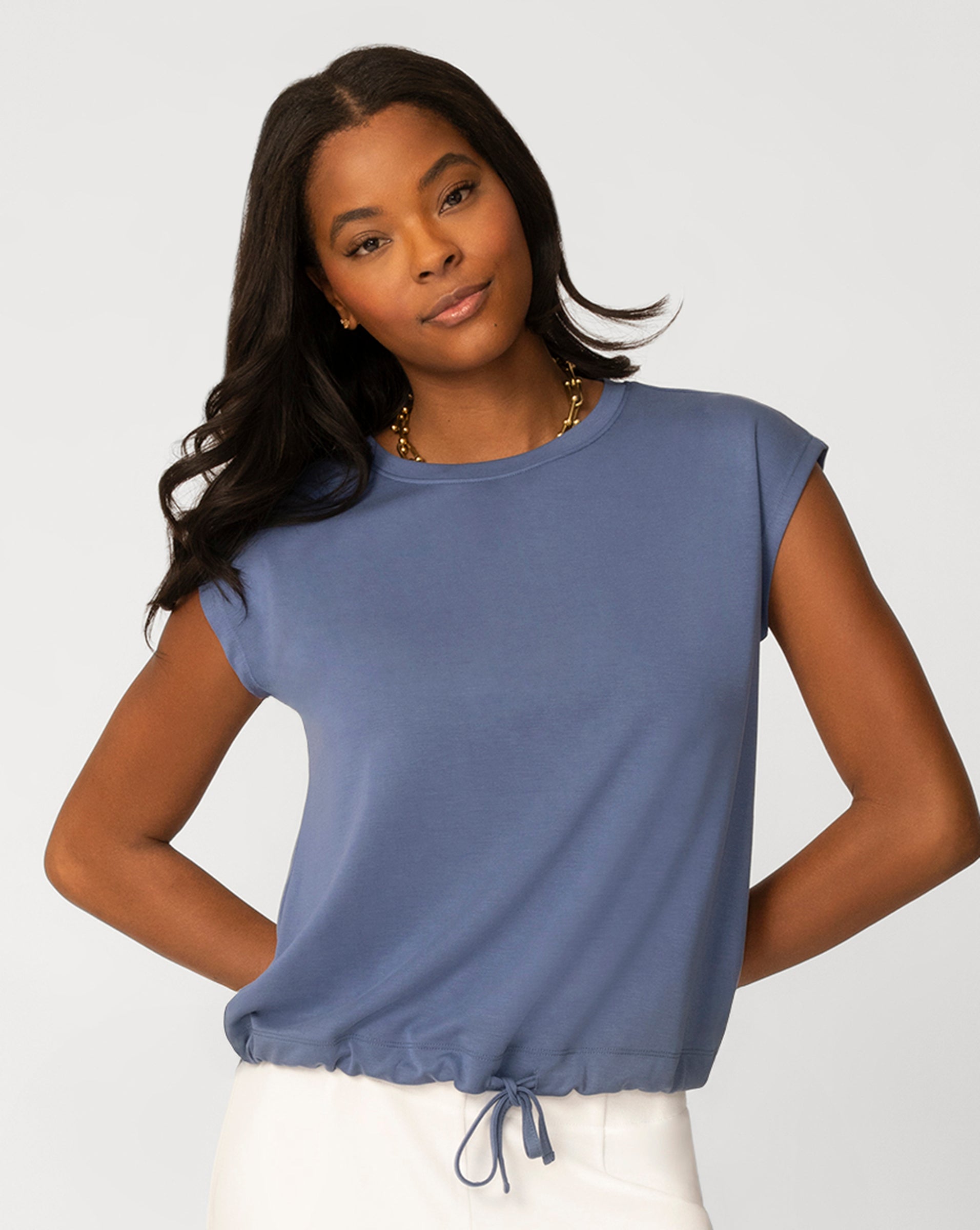 - Crewneck, cap sleeves, adjustable drawcord tie at hem