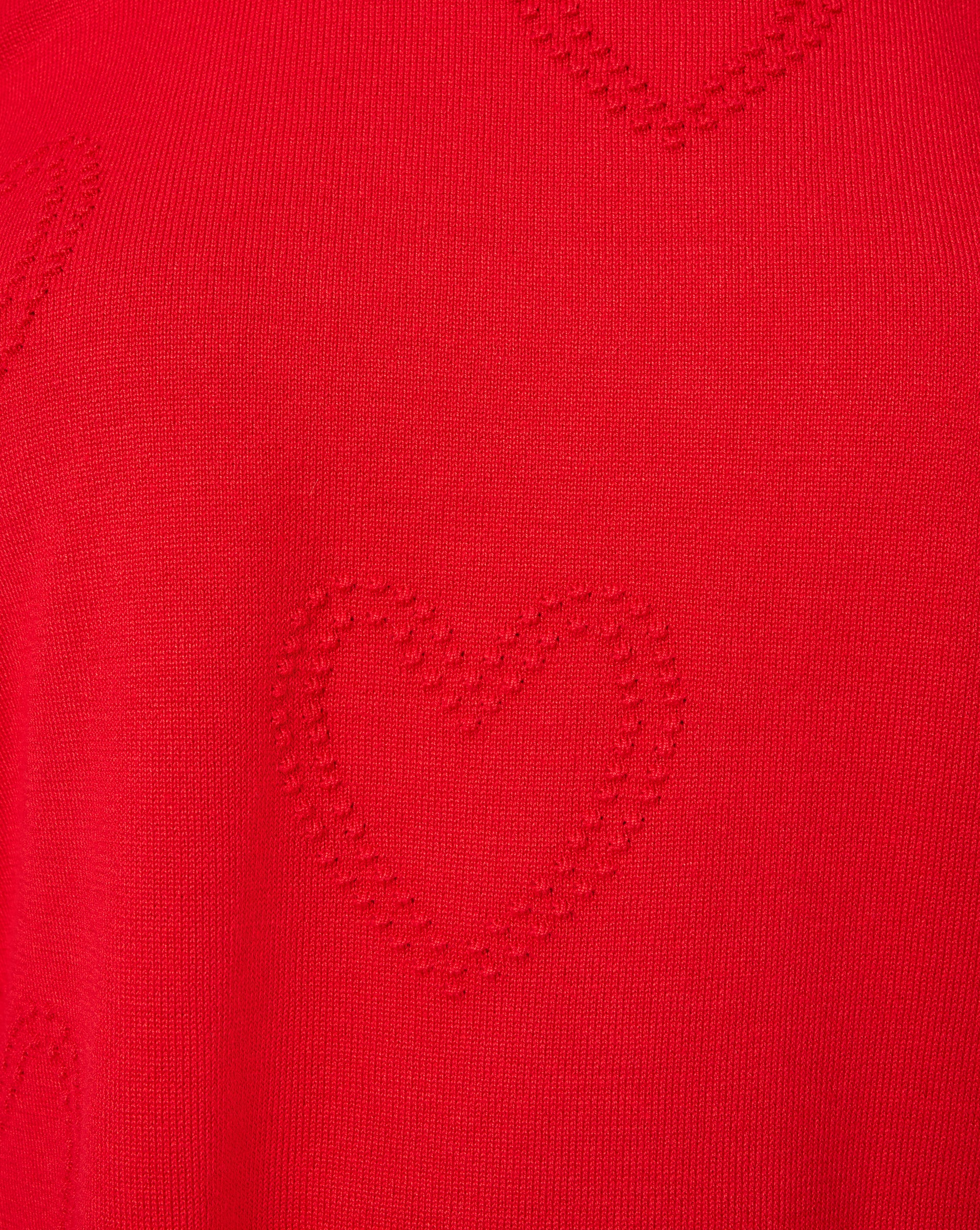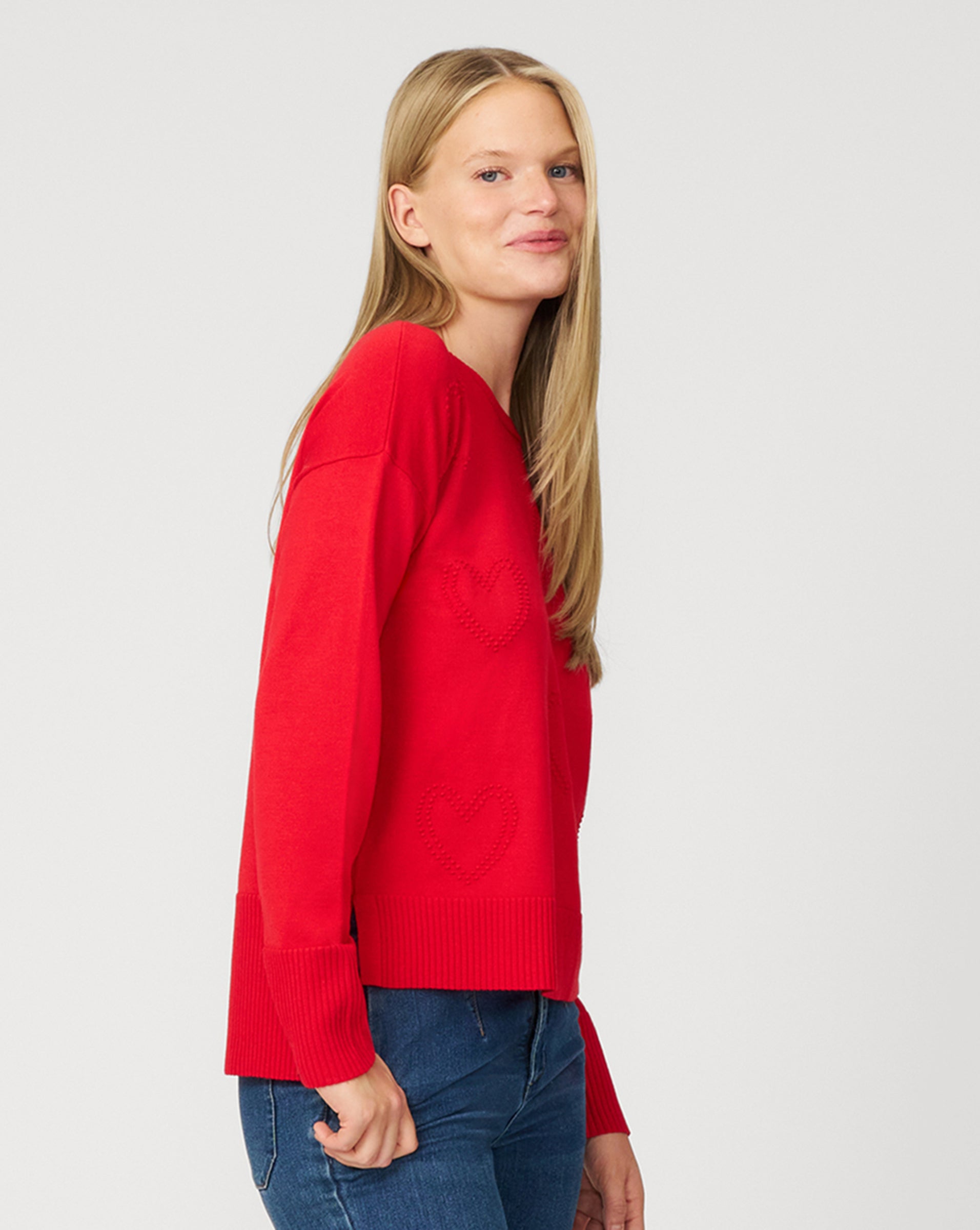 - Crew neck, long sleeves, hi-low hem, raised heart stitch detailing