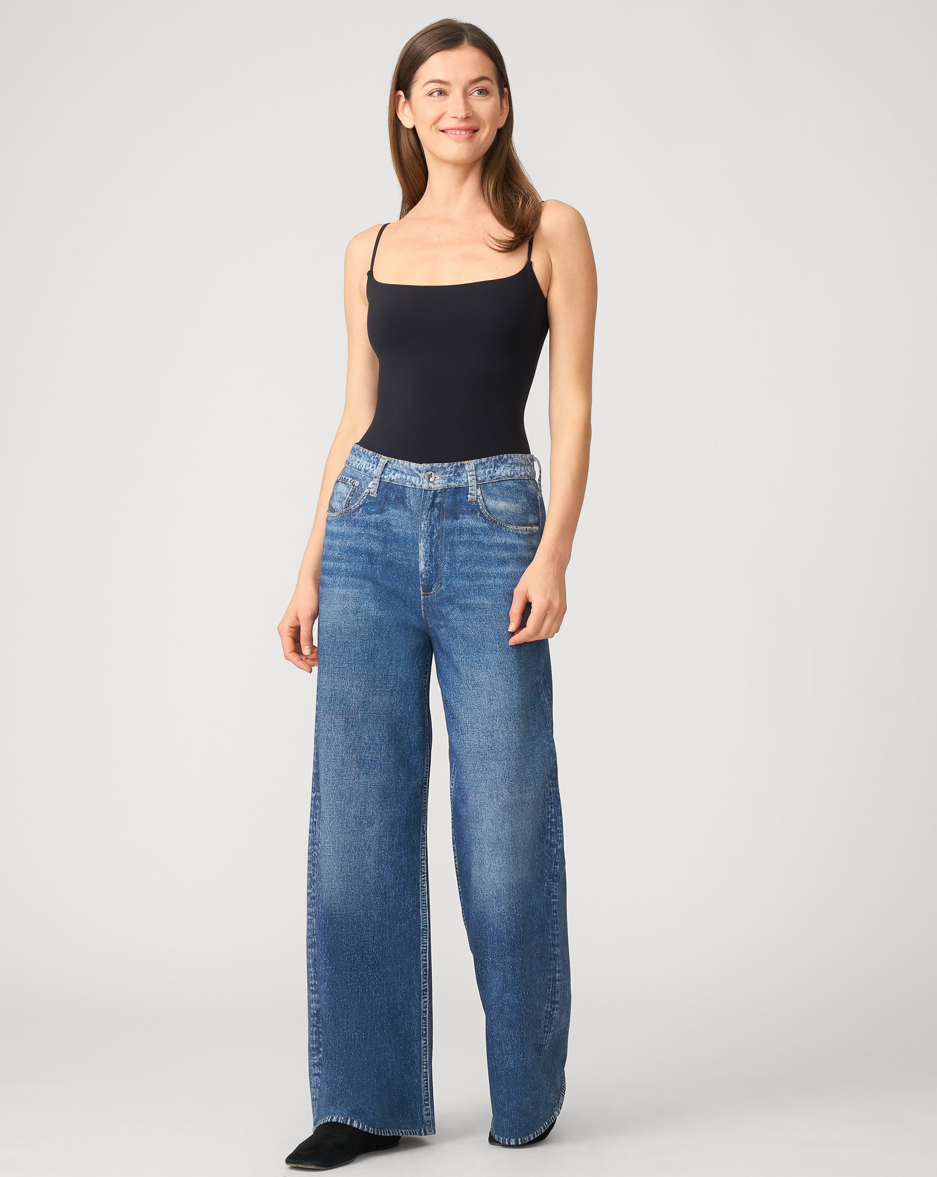 Embrace effortless style in these soft, denim print wide‑leg pants—combining a timeless silhouette with the comfort of a sweatpant. They sit comfortably at the waist with belt loops to customize your fit. Two functional front pockets and faux back pockets add modern utility, while a full zip fly and button closure complete the polished design. Effortlessly versatile, pair them with a crisp blouse for work or a simple tee on weekends for an easy, modern look.