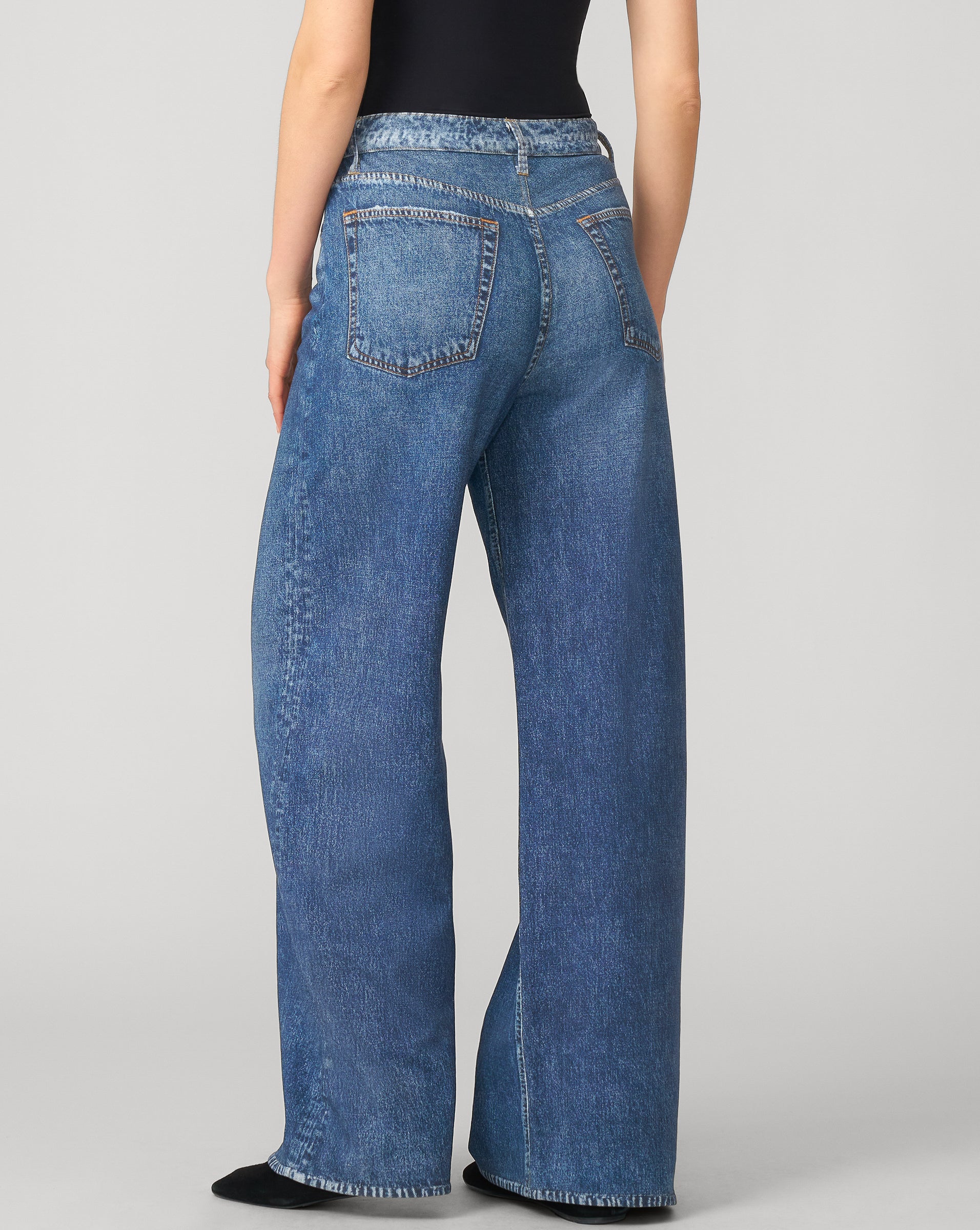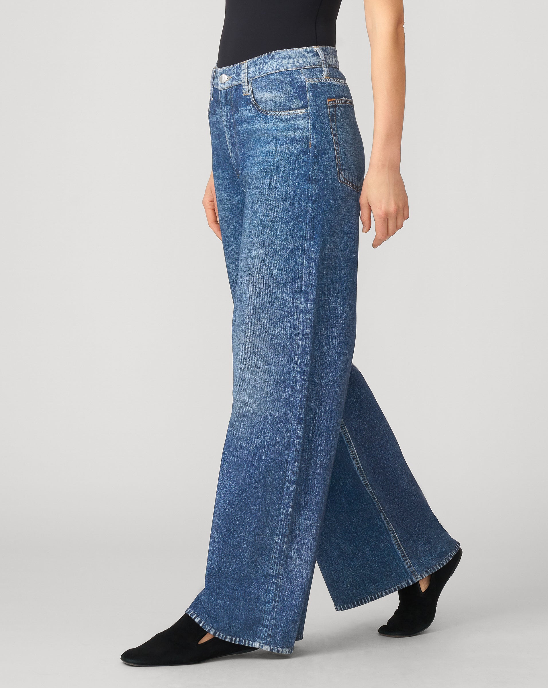 - Printed denim wide‑leg pant with belt loops, two front pockets, faux back pockets, full zip fly and button closure. Full length.