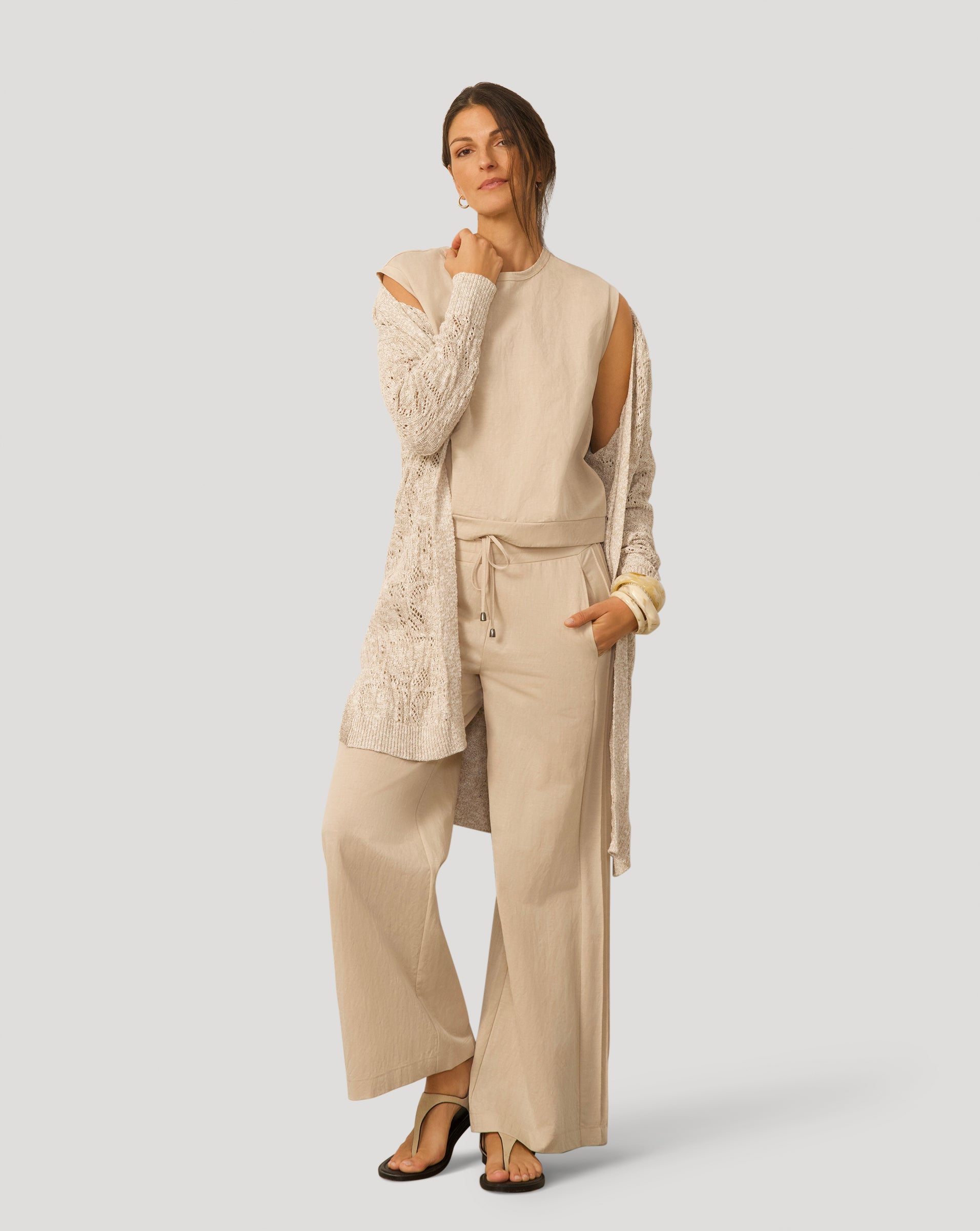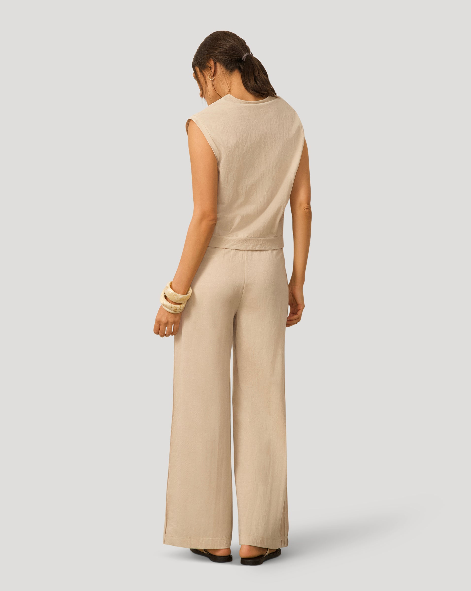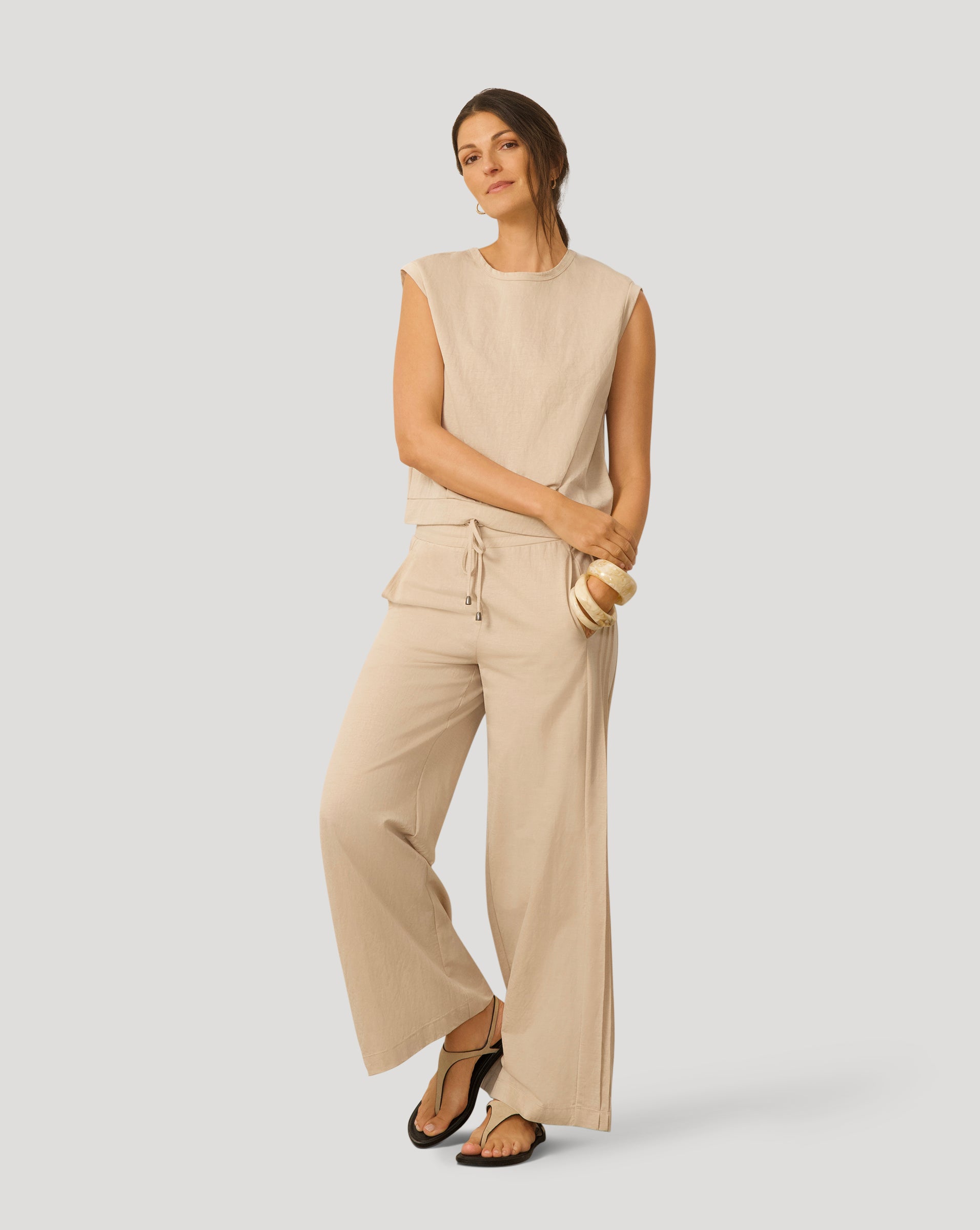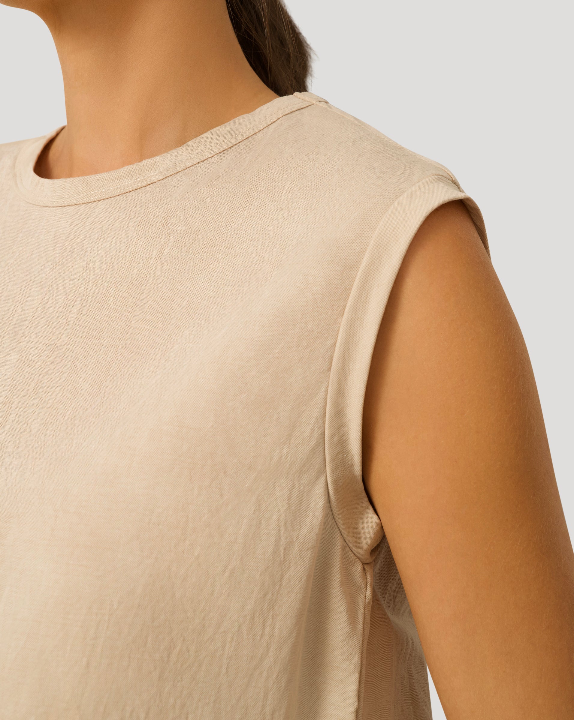 This modern sleeveless top updates a classic muscle tee with subtle waist pleating for a softly defined shape. Designed to flatter without feeling fitted, it offers an easy drape and lightweight comfort. A versatile base layer that pairs effortlessly with spring layers or stands strong on its own.