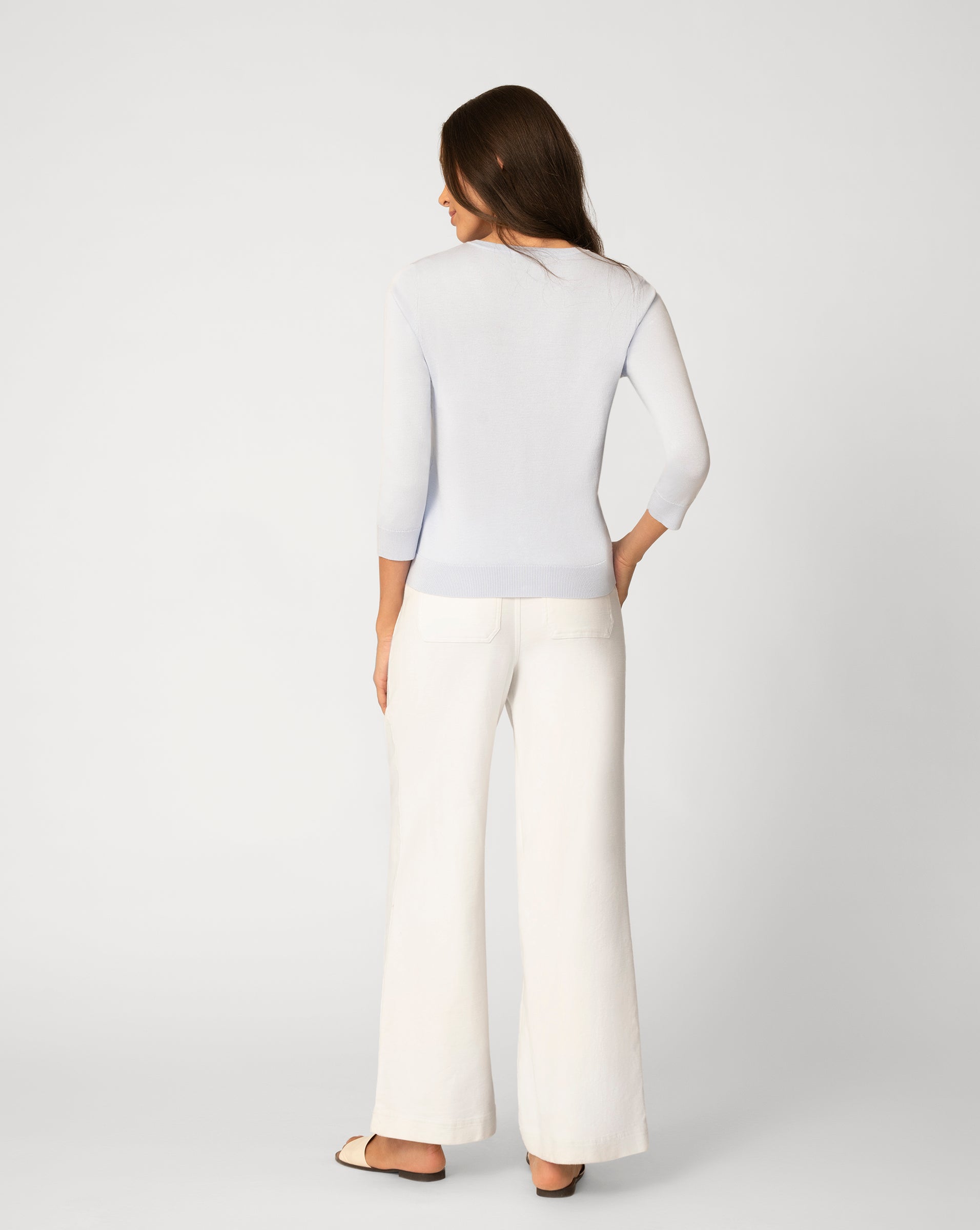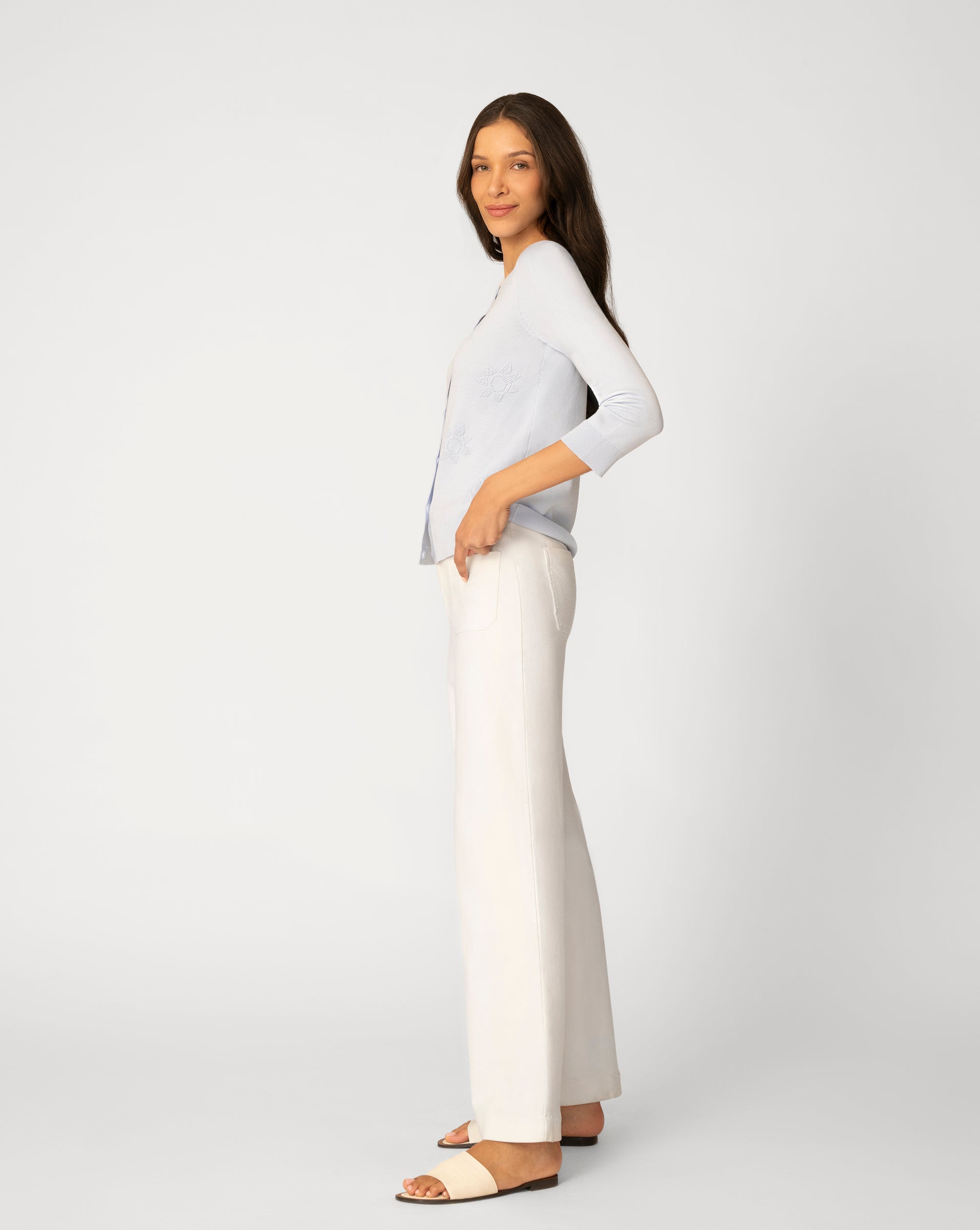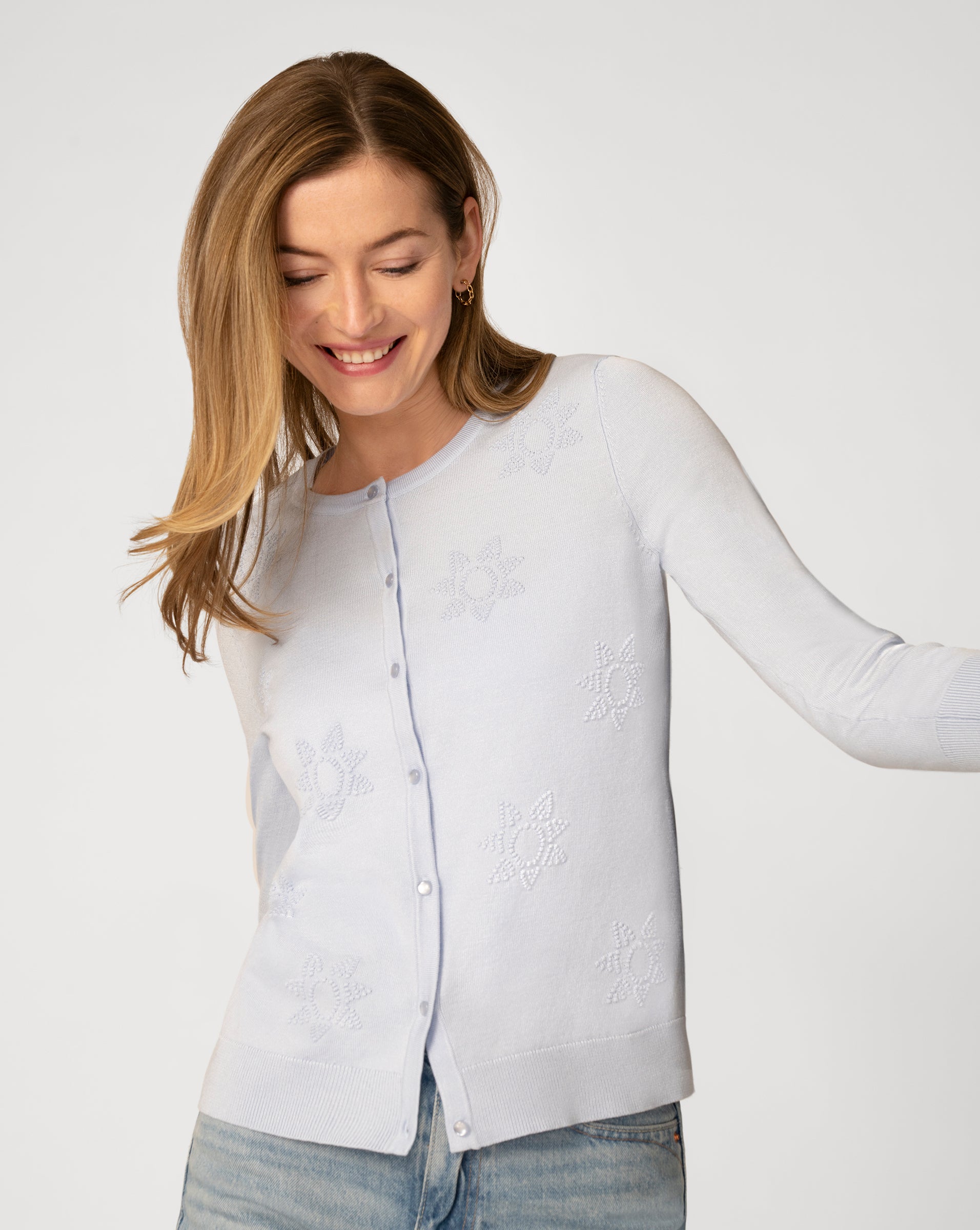 - 3/4 long sleeve, crew neck, button front cardigan, sun textured stitch