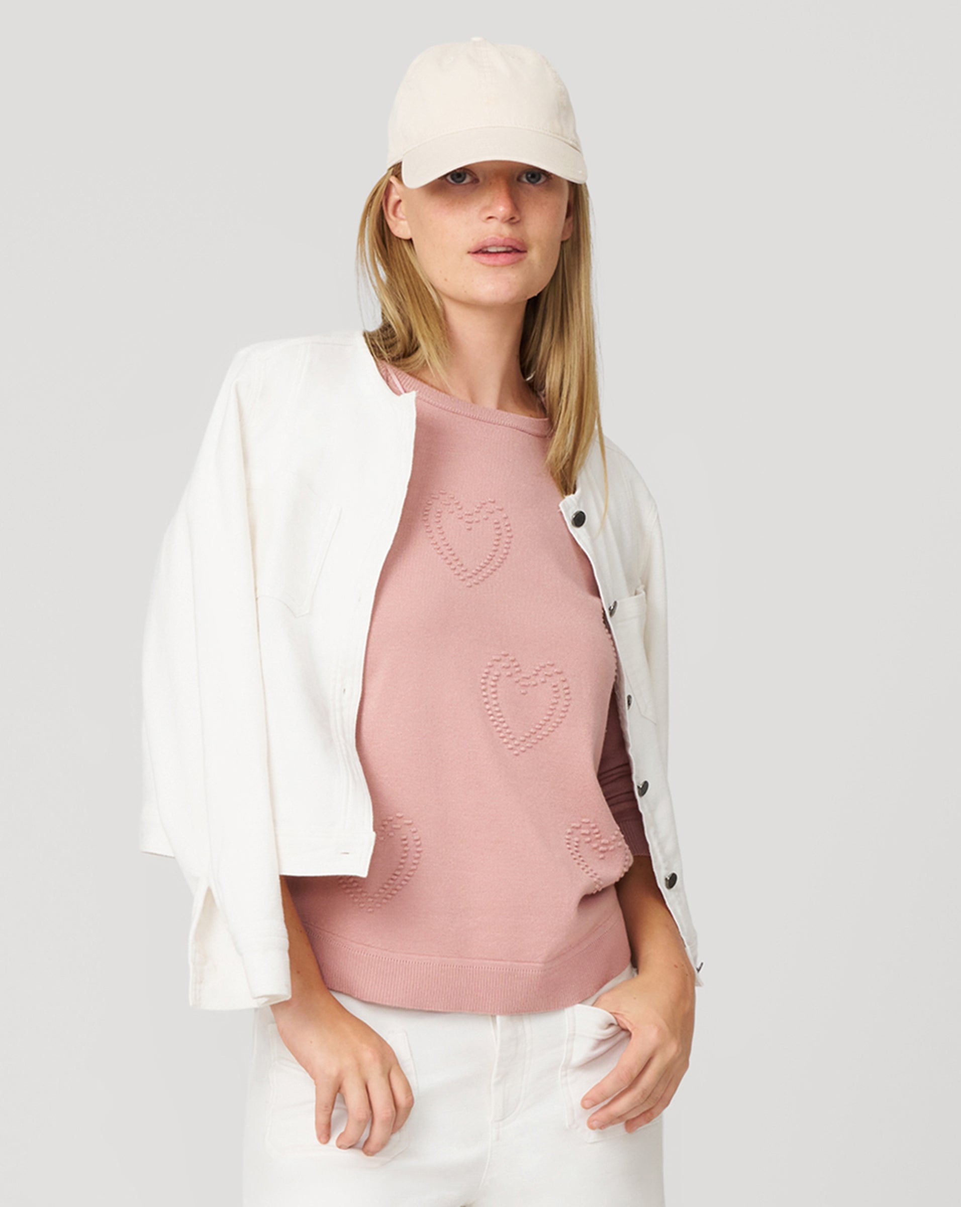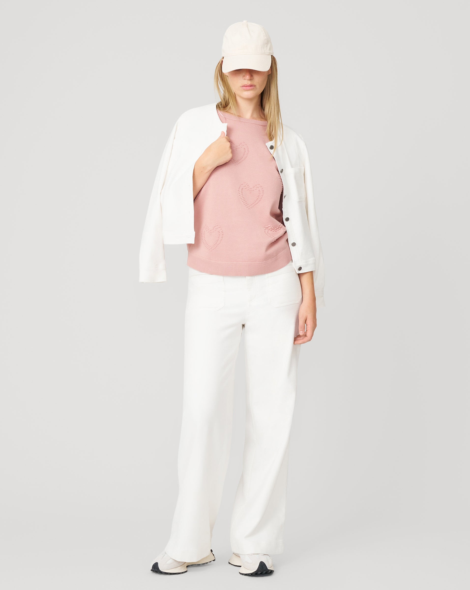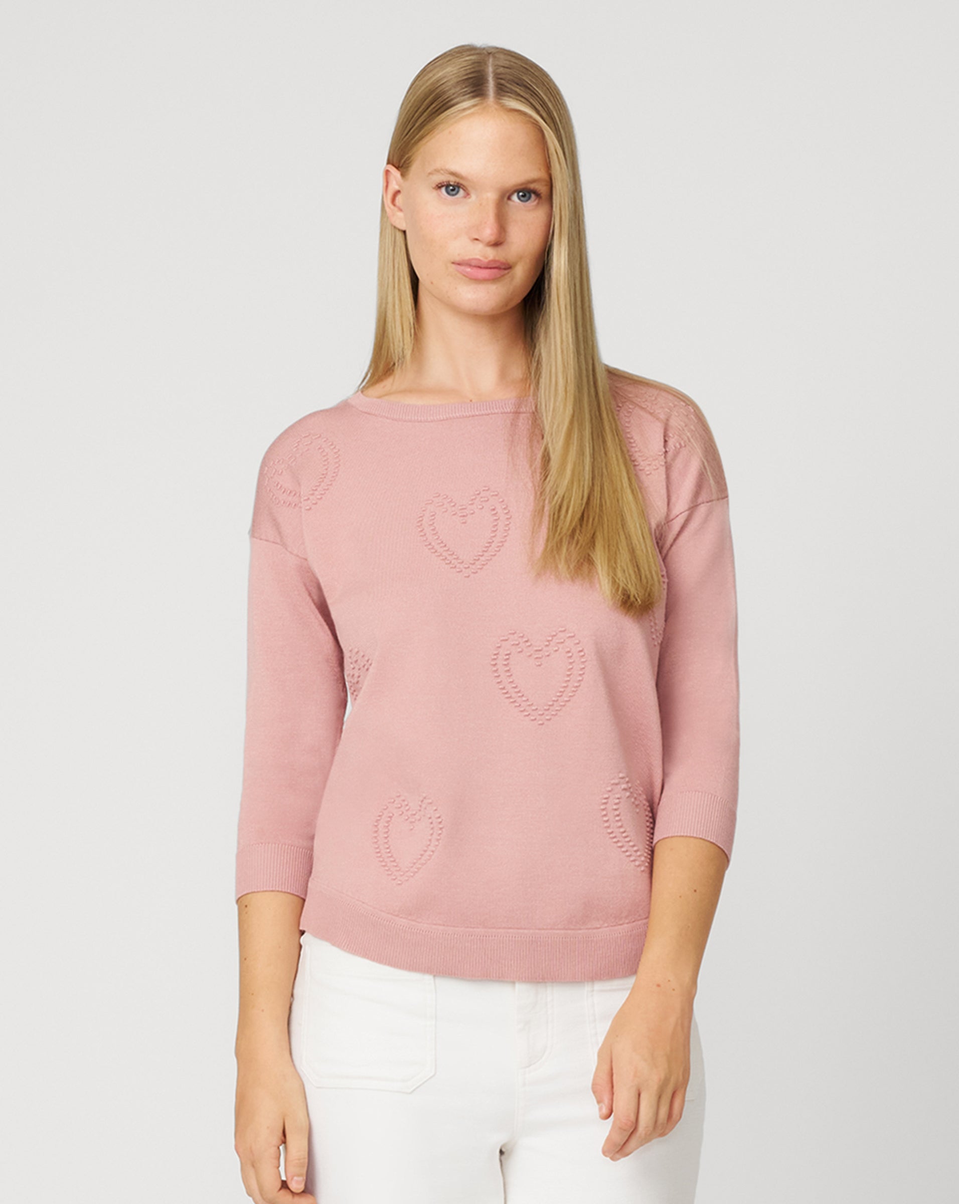- Crew neck, long sleeves, hi-low hem, raised heart stitch detailing