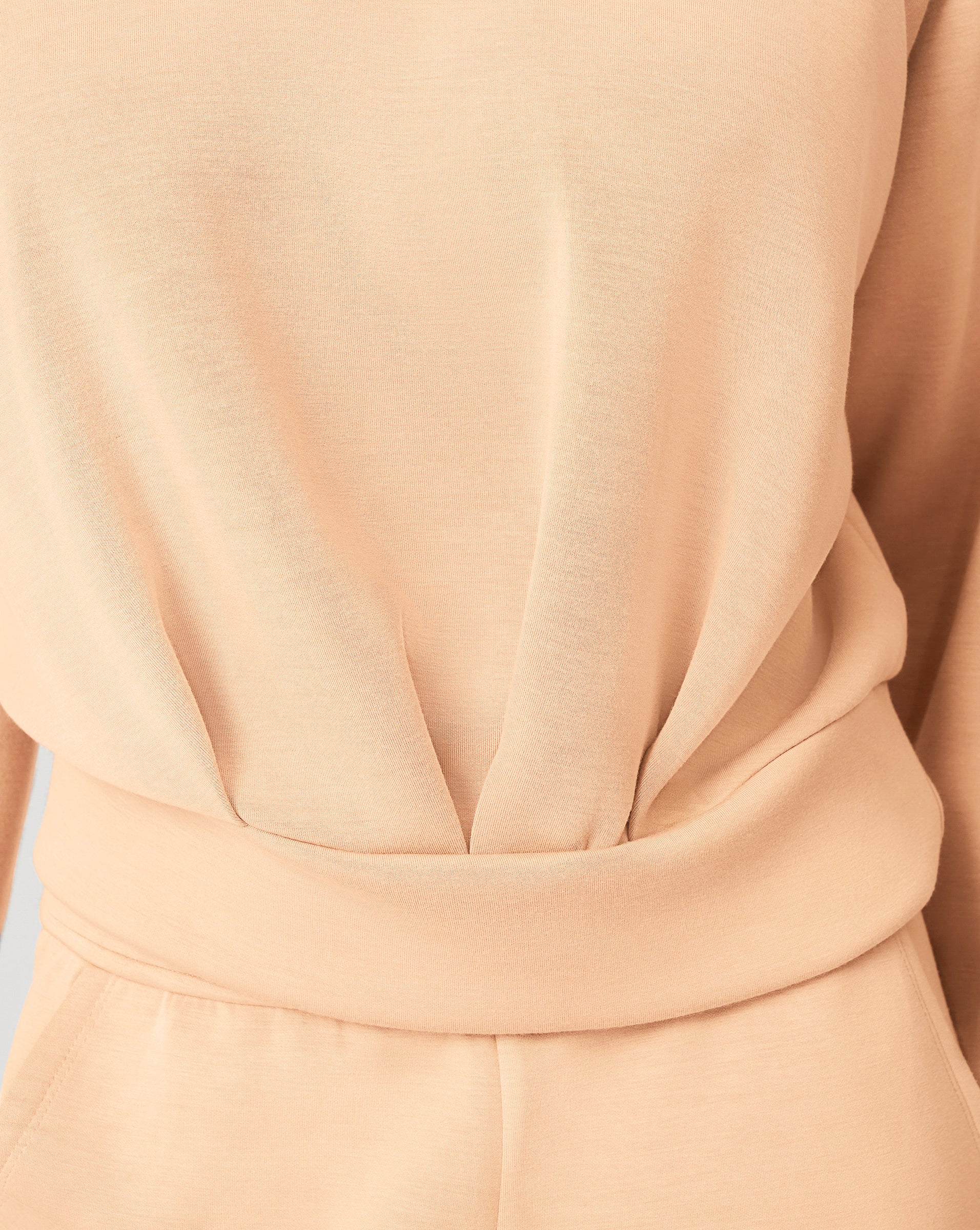 - Long sleeve, pleated front, elastic waistband pants